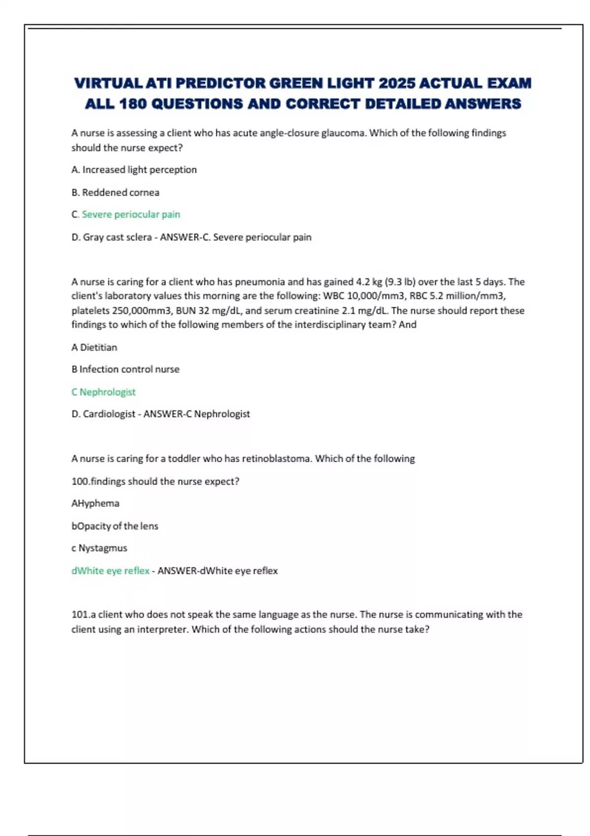 VIRTUAL ATI PREDICTOR GREENLIGHT 2025 ACTUAL EXAM ALL 180 QUESTIONS AND CORRECT DETAILED ANSWERS