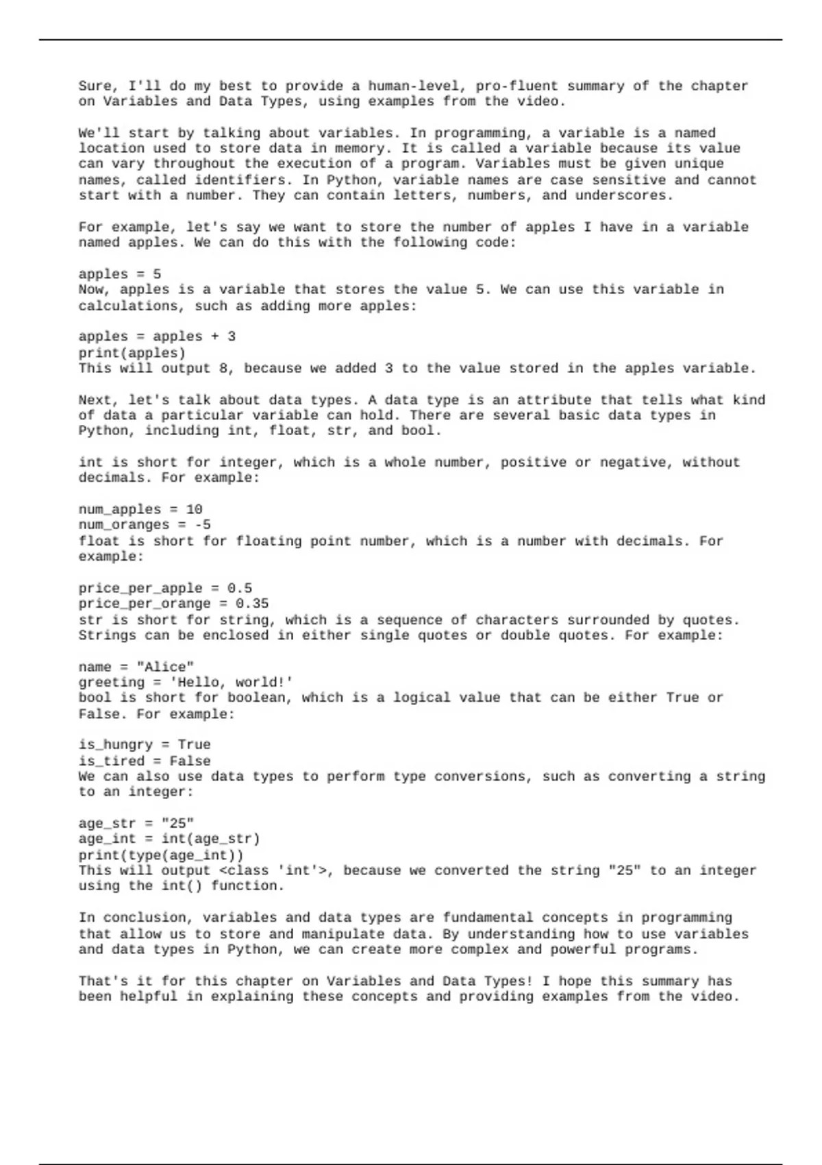 That's it for this chapter on Variables and Data Types! I hope this summary has