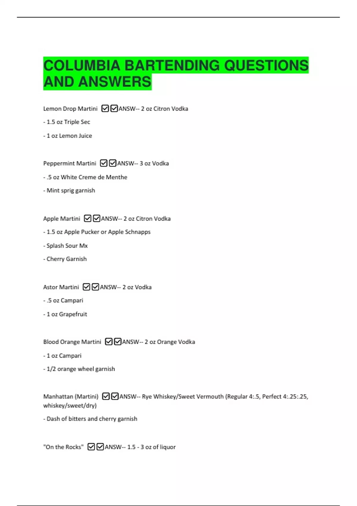 COLUMBIA BARTENDING QUESTIONS AND ANSWERS Lemon Drop Martini ANSW-- 2 oz Citron Vodka - 1.5 oz Triple Sec - 1 oz Lemon Juice Peppermint Martini ANSW-- 3 oz Vodka - .5 oz White Creme de Menthe - Mint sprig garnish Apple Martini ANSW-- 2 oz Citron Vodka - 1.5 oz Apple Pucker or Apple Schnapps