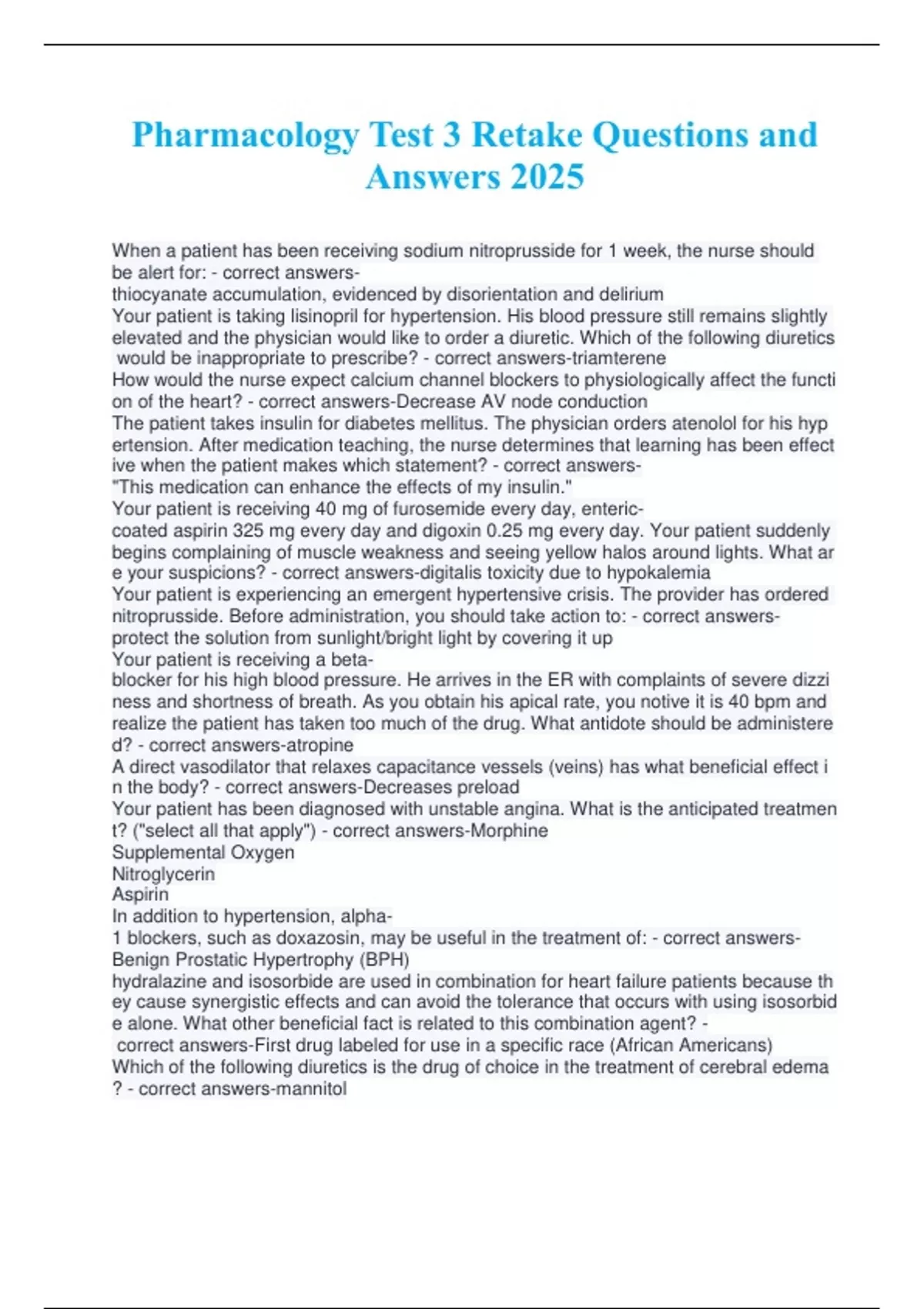 Pharmacology Test 3 Retake Questions and Answers 2025