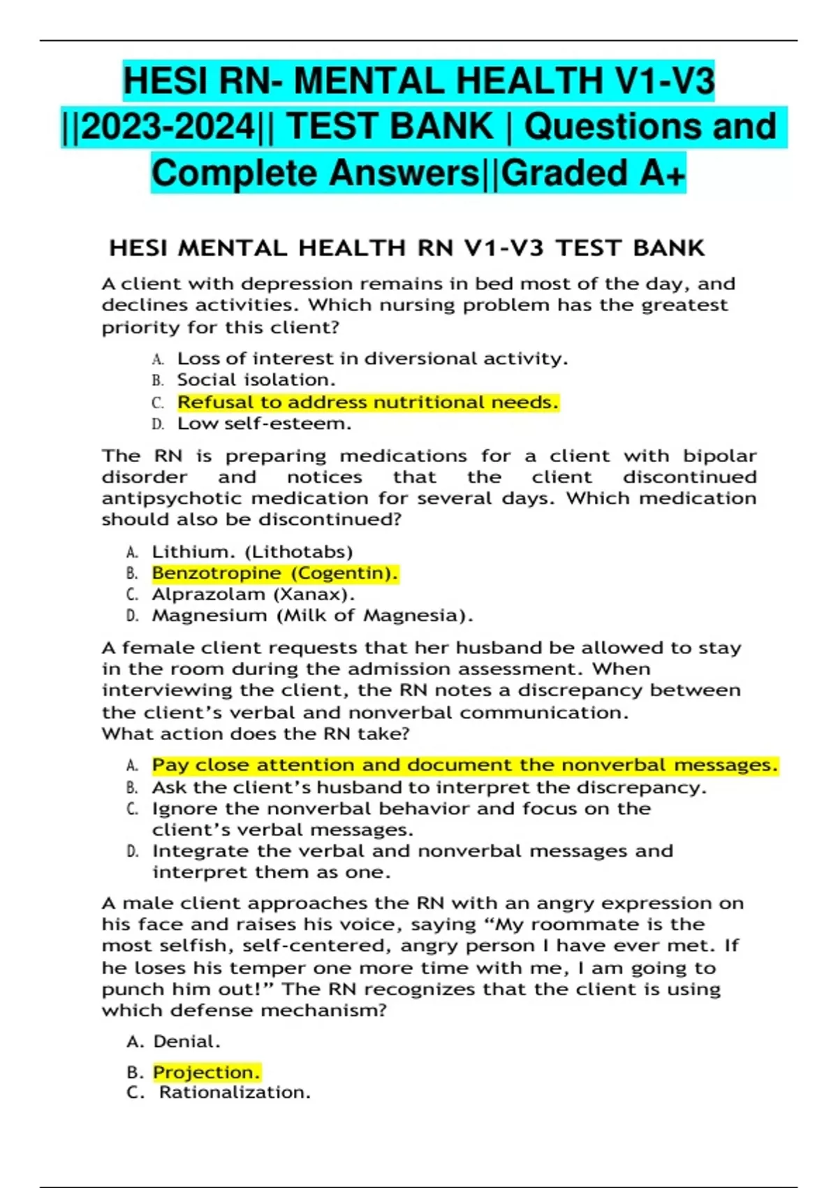 HESI MENTAL HEALTH RN V1-V3 TEST BANK