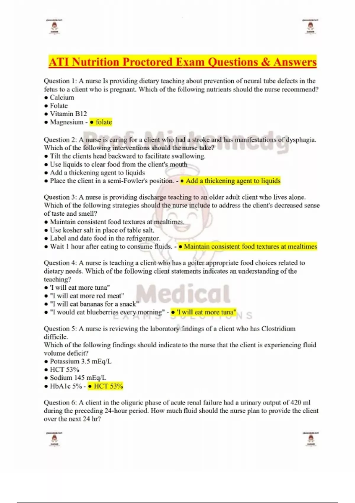 ATI Nutrition Proctored Exam Questions & Answers-Question 1: A nurse Is providing dietary teaching about prevention of neural tube defects in the fetus to a client who is pregnant. Which of the following nutrients should the nurse recommend? ● Calcium ● Folate ● Vitamin B12 ● Magnesium - ● folate Question 2: A nurse is caring for a client who had a stroke and has manifestations of dysphagia. Which of the following interventions should the nurse take? ● Tilt the clients head backward to facilitate swallowing. ● Use liquids to clear food from the client's mouth ● Add a thickening agent to liquids ● Place the client in a semi-Fowler's position. - ● Add a thickening agent to liquids Question 3: A nurse is providing discharge teaching to an older adult client who lives alone. Which of the following strategies should the nurse include to address the client's decreased sense of taste and smell? ● Maintain consistent food textures at mealtimes. ● Use kosher salt in place of table salt. ● Label and date food in the refrigerator. ● Wait 1 hour after eating to consume fluids. - ● Maintain consistent food textures at mealtimes Question 4: A nurse is teaching a client who has a goiter appropriate food choices related to dietary needs. Which of the following client statements indicates an understanding of the teaching? ● 'I will eat more tuna" ● "I will eat more red meat" ● "I will eat bananas for a snack" ● "I would eat blueberries every morning" - ● 'I will eat more tuna" Question 5: A nurse is reviewing the laboratory findings of a client who has Clostridium difficile. Which of the following findings should indicate to the nurse that the client is experiencing fluid volume deficit? ● Potassium 3.5 mEq/L ● HCT 53% ● Sodium 145 mEq/L ● HbA1c 5% - ● HCT 53% Question 6: A client in the oliguric phase of acute renal failure had a urinary output of 420 ml during the preceding 24-hour period. How much fluid should the nurse plan to provide the client over the next 24 hr? ● 2,550 ml ● 1,530 ml ● 920 ml ● 2,040 ml - ● 920 ml Question 7: A nurse is teaching a client ways to manage anorexia while receiving radiation therapy. Which of the following instructions should the nurse include in the teaching? ● "Limit High-kilocalorie supplements to between meals." ● "Eat hot food rather than cold foods." ● "Avoid overeating during "good" days." ● "Consume nutrition-dense foods first." - ● "Consume nutrition-dense foods first." Question 8: A nurse is teaching a client who is receiving bolus feeding through a nasogastric tube about dumping syndrome. The nurse should instruct the client to report which of the following manifestations? ● Constipation ● Bradycardia ● Drowsiness ● Dizziness - ●Bradycardia Question 9: A client is receiving a thiazide diuretic for treatment of hypertension. Which of the following foods selected by the client reflects understanding of the nurses teaching regarding this medication? ● Navy beans and ham ● Baked potato ● Cheddar cheese ● Beef broth - ● Baked potato Question 10: A nurse is teaching about nutrition to a client who has a new diagnosis of chronic kidney disease. Which of the following recommendations should the nurse include in the teaching? ● Limit calcium intake ● Increase potassium intake ● Limit protein intake ● Increase phosphorus intake - ● Limit protein intake Question 11: A nurse is caring for a client who has stomatitis following radiation therapy. Which of the following interventions is appropriate for the nurse to take? ● Discourage the use of a straw. ● Offer the client frozen bananas as a snack. ● Serve the client hot meals. ● Avoid serving sauces or gravies. - ● Offer the client frozen bananas as a snack A nurse is teaching the Guardians of a school-age child about nutrition. Which of the following statements should the nurse make? ● You should have your child skip breakfast ● You should eat meals together most of the time ● You should provide your child with whole fat milk ● You should reward good behavior with food - ● You should eat meals together most of the time Question 13: A nurse is assessing an older adult client who has dysphagia and is experiencing dehydration. Which of the following findings should the nurse expect? ● Tachycardia ● Distended neck veins ● Decrease respiratory rate ● Hypertension - ● Tachycardia
