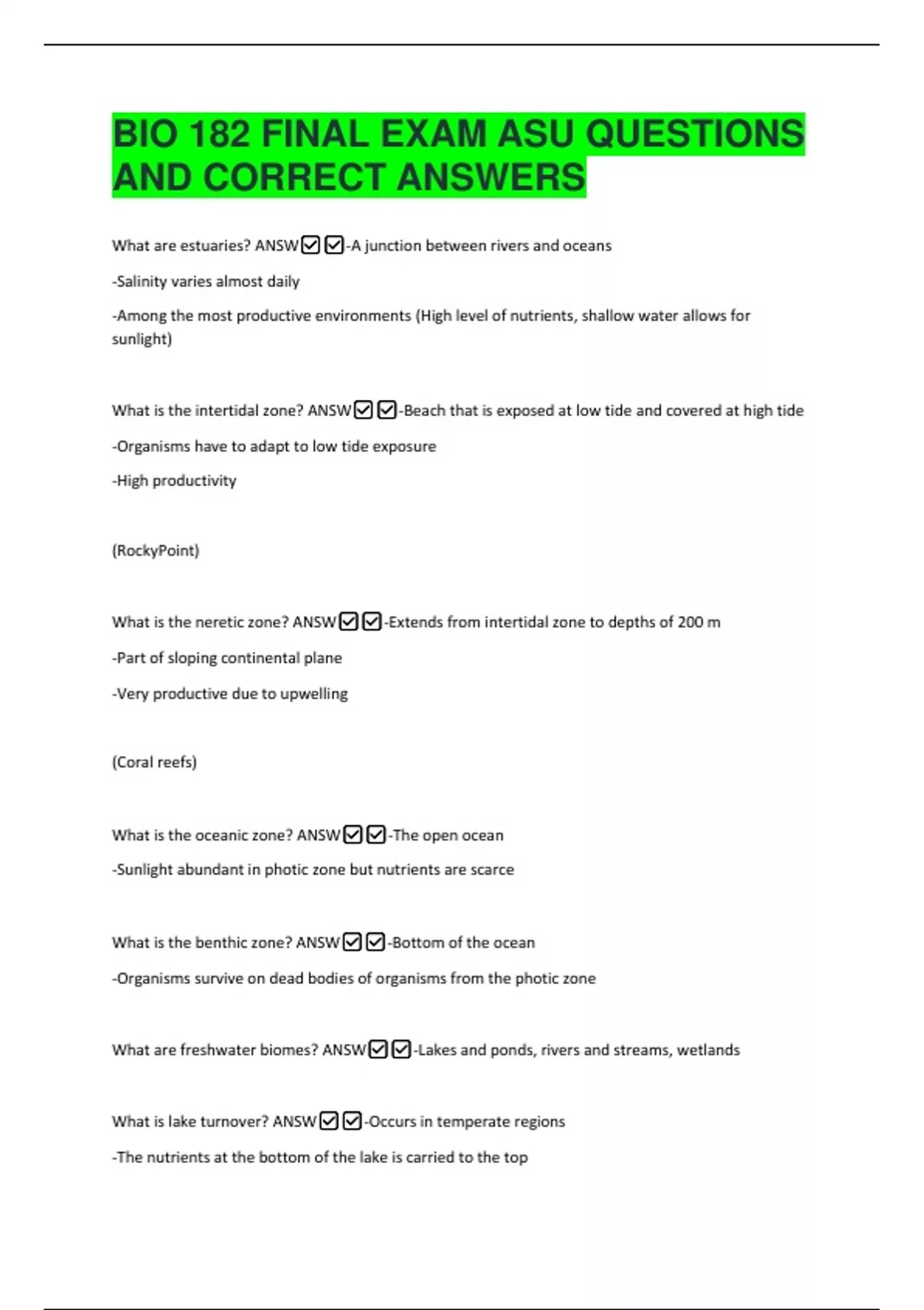 BIO 182 FINAL EXAM ASU QUESTIONS AND CORRECT ANSWERS What are estuaries? ANSW-A junction between rivers and oceans -Salinity varies almost daily -Among the most productive environments (High level of nutrients, shallow water allows for sunlight) What is the intertidal zone? ANSW-Beach that is exposed at low tide and covered at high tide -Organisms have to adapt to low tide exposure -High productivity (RockyPoint)