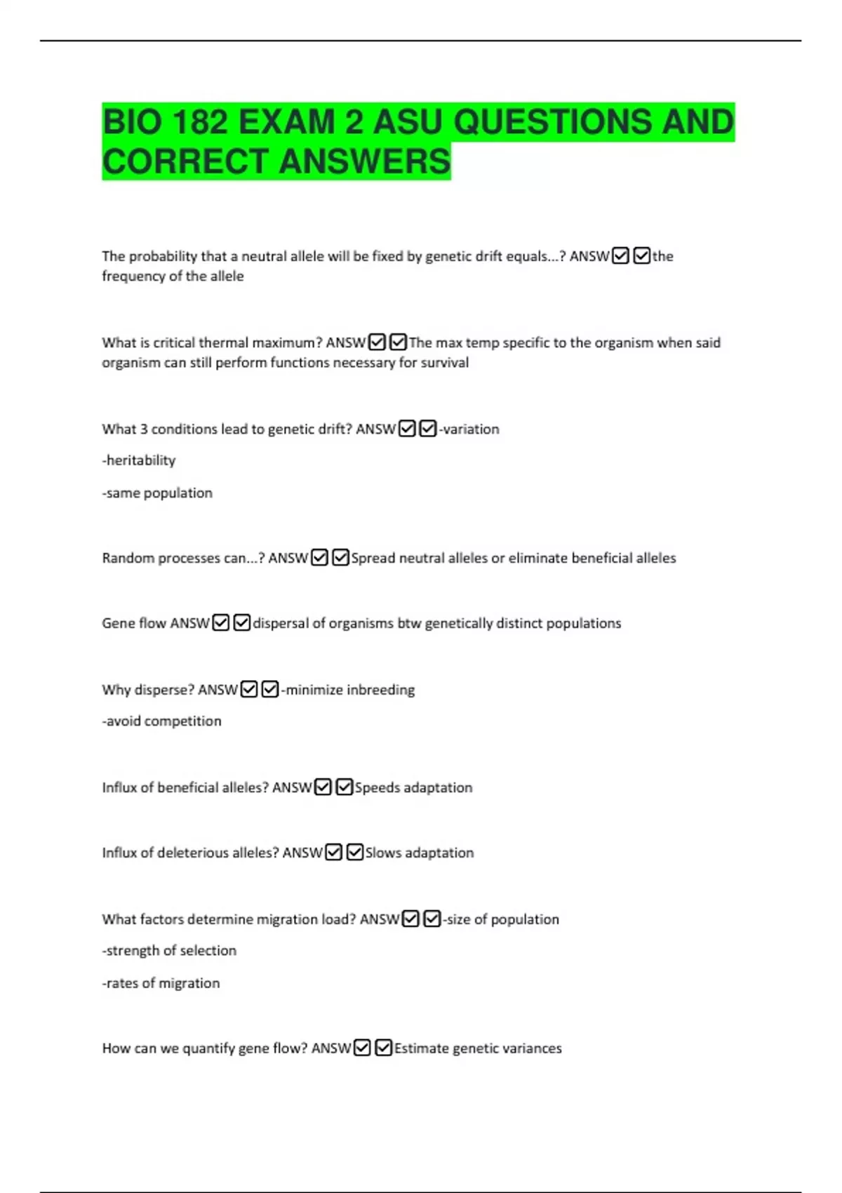 BIO 182 EXAM 2 ASU QUESTIONS AND CORRECT ANSWERS The probability that a neutral allele will be fixed by genetic drift equals...? ANSWthe frequency of the allele What is critical thermal maximum? ANSWThe max temp specific to the organism when said organism can still perform functions necessary for survival What 3 conditions lead to genetic drift? ANSW-variation -heritability -same population Random processes can...? ANSWSpread neutral alleles or eliminate beneficial alleles