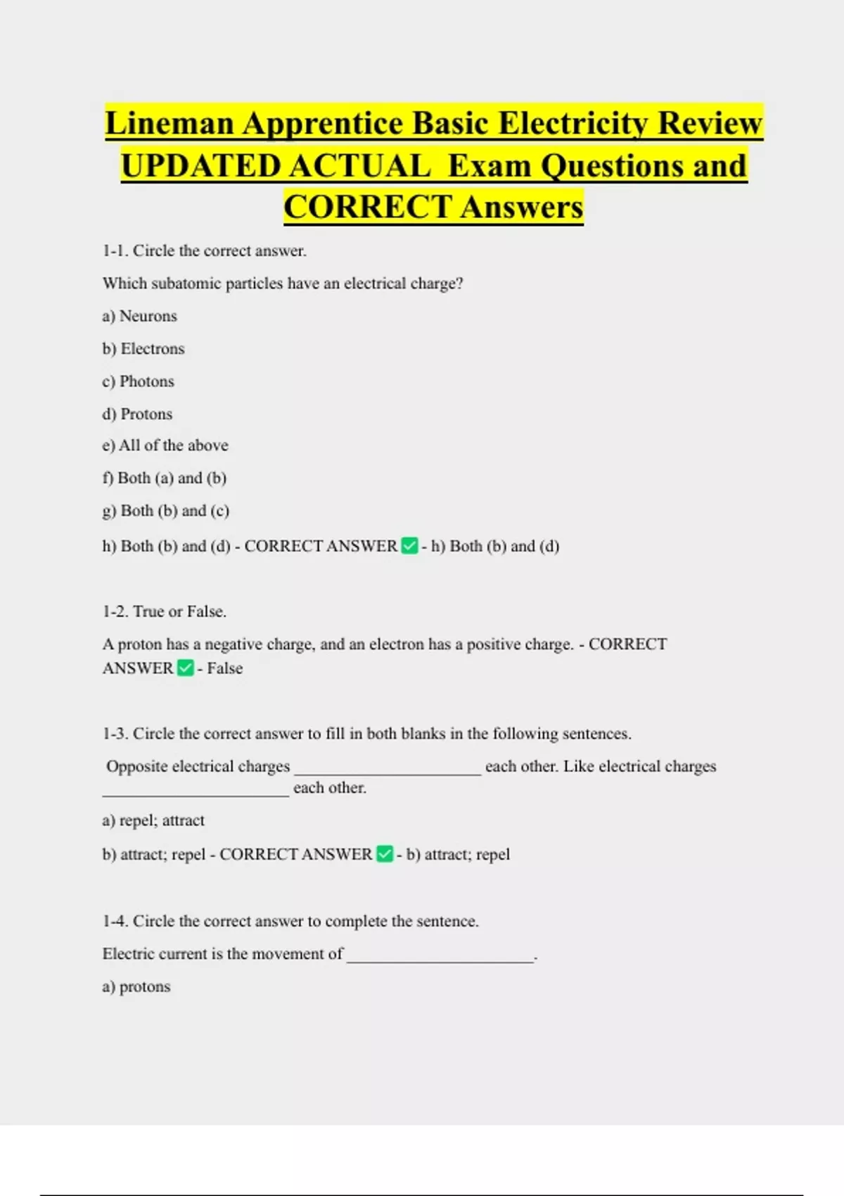 Lineman Apprentice Basic Electricity Review UPDATED ACTUAL Exam Questions and CORRECT Answers 1-1. Circle the correct answer. Which subatomic particles have an electrical charge? a) Neurons b) Electrons c) Photons d) Protons e) All of the above f) Both (a) and (b) g) Both (b) and (c) h) Both (b) and (d) - CORRECT ANSWER - h) Both (b) and (d)