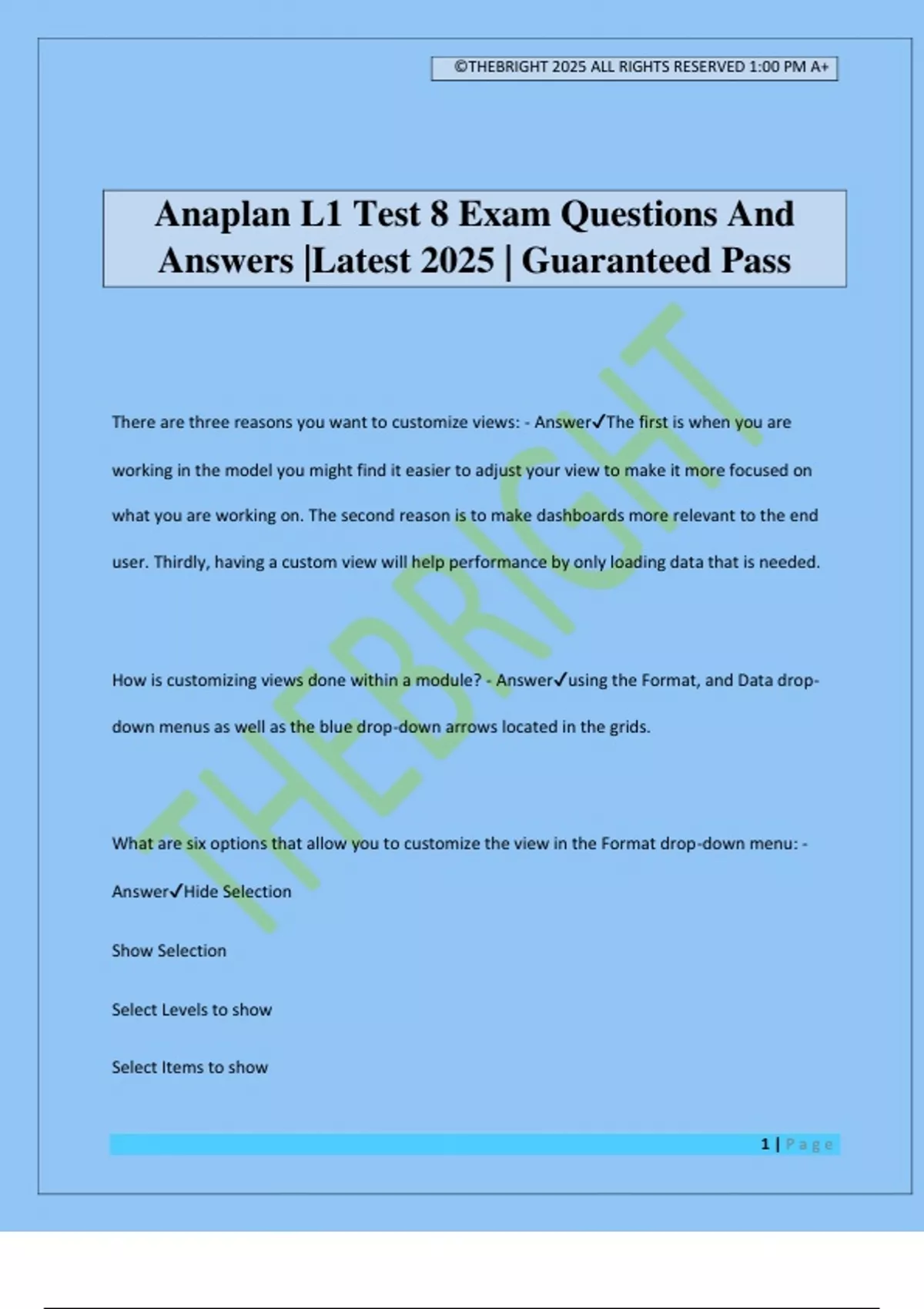 Anaplan L1 Test 8 Exam Questions And