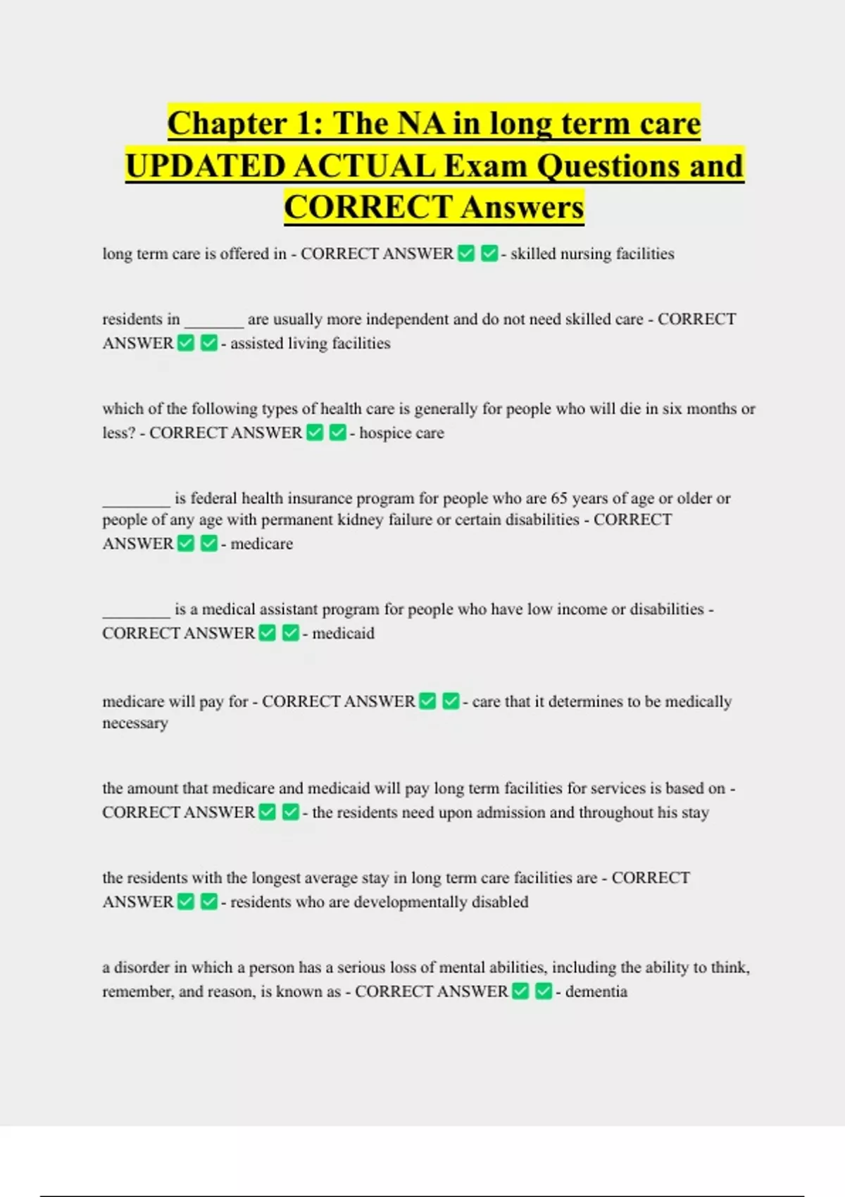 Chapter 1: The NA in long term care UPDATED ACTUAL Exam Questions and CORRECT Answers long term care is offered in - CORRECT ANSWER - skilled nursing facilities residents in _______ are usually more independent and do not need skilled care - CORRECT ANSWER - assisted living facilities which of the following types of health care is generally for people who will die in six months or less? - CORRECT ANSWER - hospice care