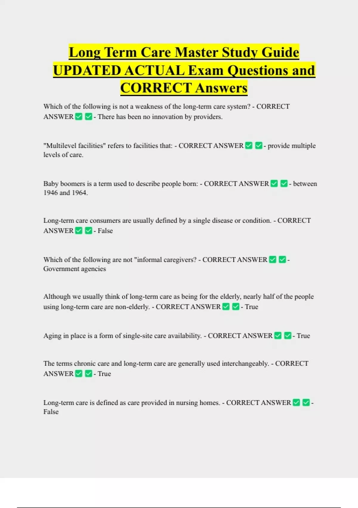 Long-term care is defined as care provided in nursing homes. - CORRECT ANSWER -
