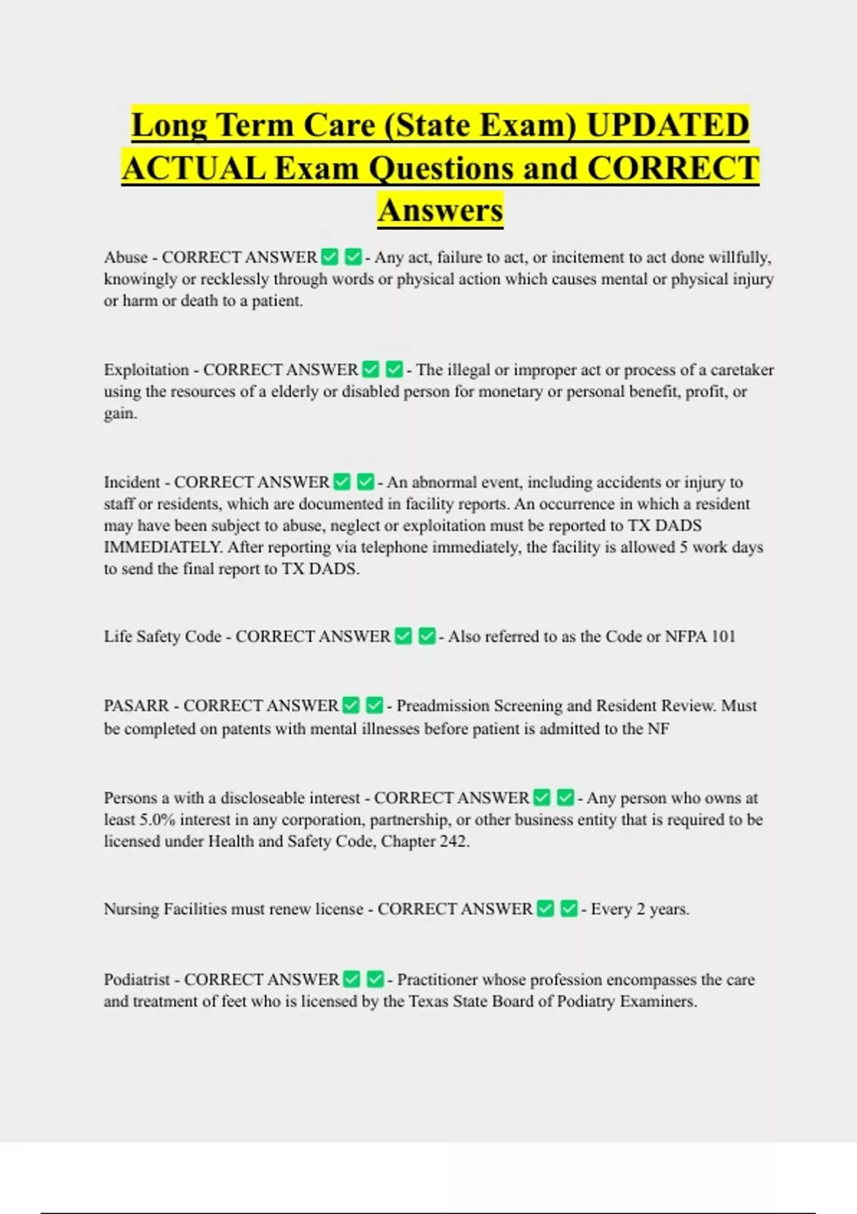Long Term Care (State Exam) UPDATED