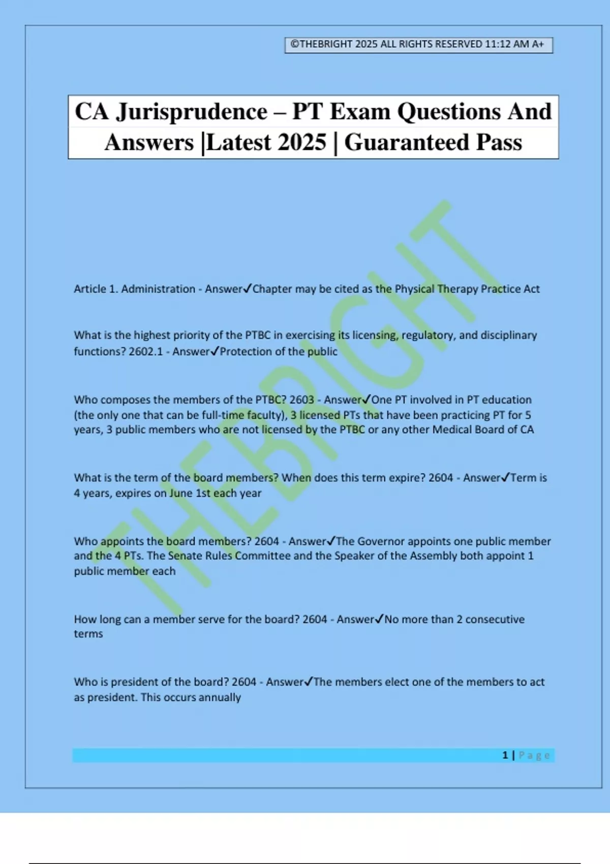 ©THEBRIGHT 2025 ALL RIGHTS RESERVED 11:12 AM A+ 1 | P a g e CA Jurisprudence – PT Exam Questions And Answers |Latest 2025 | Guaranteed Pass Article 1. Administration - AnswerChapter may be cited as the Physical Therapy Practice Act What is the highest priority of the PTBC in exercising its licensing, regulatory, and disciplinary functions? 2602.1 - AnswerProtection of the public Who composes the members of the PTBC? 2603 - AnswerOne PT involved in PT education (the only one that can be full-time faculty), 3 licensed PTs that have been practicing PT for 5 years, 3 public members who are not licensed by the PTBC or any other Medical Board of CA What is the term of the board members? When does this term expire? 2604 - AnswerTerm is 4 years, expires on June 1st each year Who appoints the board members? 2604 - AnswerThe Governor appoints one public member and the 4 PTs. The Senate Rules Committee and the Speaker of the Assembly both appoint 1 public member each How long can a member serve for the board? 2604 - AnswerNo more than 2 consecutive terms Who is president of the board? 2604 - AnswerThe members elect one of the members to act as president. This occurs annually ©THEBRIGHT 2025 ALL RIGHTS RESERVED 11:12 AM A+ 2 | P a g e Who can remove members of the board, and under what circumstances? 2604 - AnswerThe appointing power has the ability to remove members for neglect of duties required by law OR for unprofessional/dishonorable conduct What are the mandatory qualifications for the public members of the board? 2604.5 - AnswerShall be a citizen of CA, shall NOT be an officer/faculty member engaged in PT education, shall NOT be licensed by the Medical Board of CA What is the compensation for board members? 2606 Section 103 - AnswerPer diem $100 for each day spent in the discharge of official duties, reimbursed for traveling and other expenses incurred from the performance of official duties. These are subject to the availability of money. The member cannot receive board money for a day on which they were compensated for their regular employment. May the board have employees? 2607 - AnswerThe board may employ clerical assistants and employees deemed necessary to carry out its powers and duties. They shall be considered public employees Who is the "Executive Officer?" 2607.5 - AnswerA person exempt from civil service that exercises the powers and performs the duties delegated by the board. They are appointed by the board. What does the Inspections/Report section state? 2608.5 - AnswerEach board member or licensed PT appointed by the board may inspect or require reports from any place providing PT services including their records with respect to PT services. When and where MUST the board hold meetings? 2611 - AnswerAt least once a year, meetings shall be held in Sacramento, LA, and SF. Additional meetings may be held as designated by the board until business is concluded. How must the board give notice of meetings? 2612 - AnswerNotice will be given in accordance with the Bagley-Keene O