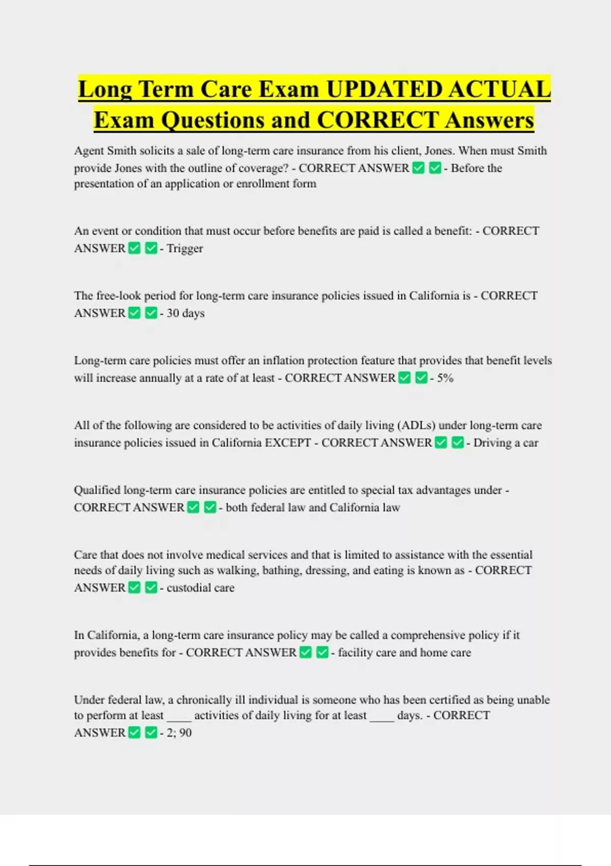 Long Term Care Exam UPDATED ACTUAL Exam Questions and CORRECT Answers Agent Smith solicits a sale of long-term care insurance from his client, Jones. When must Smith provide Jones with the outline of coverage? - CORRECT ANSWER - Before the presentation of an application or enrollment form An event or condition that must occur before benefits are paid is called a benefit: - CORRECT ANSWER - Trigger The free-look period for long-term care insurance policies issued in California is - CORRECT ANSWER - 30 days