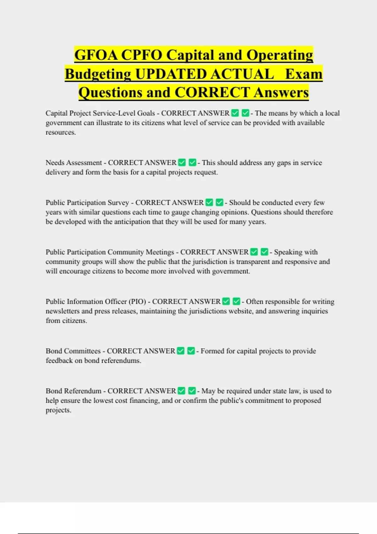 GFOA CPFO Capital and Operating Budgeting UPDATED ACTUAL Exam Questions and CORRECT Answers Capital Project Service-Level Goals - CORRECT ANSWER - The means by which a local government can illustrate to its citizens what level of service can be provided with available resources. Needs Assessment - CORRECT ANSWER - This should address any gaps in service delivery and form the basis for a capital projects request. Public Participation Survey - CORRECT ANSWER - Should be conducted every few years with similar questions each time to gauge changing opinions. Questions should therefore be developed with the anticipation that they will be used for many year