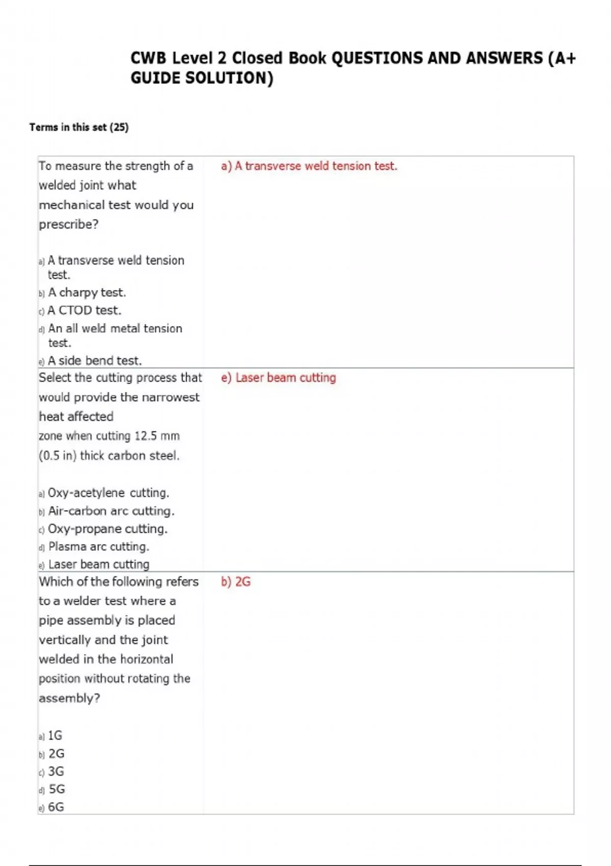 To measure the strength of a welded joint what mechanical test would you prescribe? a) A transverse weld tension test. b) A charpy test. c) A CTOD test. d) An all weld metal tension test. e) A side bend test. a) A transverse weld tension test. Select the cutting process that would provide the narrowest heat affected zone when cutting 12.5 mm (0.5 in) thick carbon steel. a) Oxy-acetylene cutting. b) Air-carbon arc cutting. c) Oxy-propane cutting. d) Plasma arc cutting. e) Laser beam cutting e) Laser beam cutting Which of the following refers to a welder test where a pipe assembly is placed vertically and the joint welded in the horizontal position without rotating the assembly? a) 1G b) 2G c) 3G d) 5G e) 6G