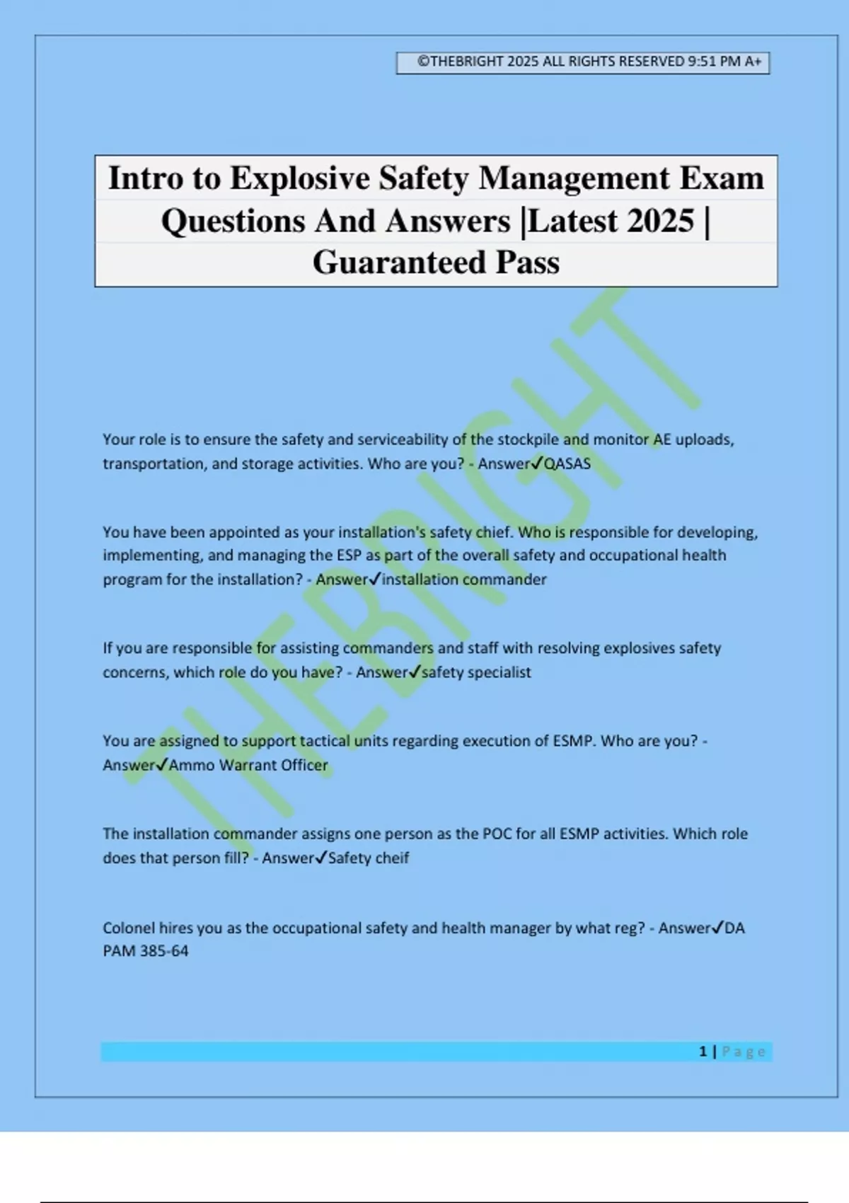 ©THEBRIGHT 2025 ALL RIGHTS RESERVED 9:51 PM A+ 1 | P a g e Intro to Explosive Safety Management Exam Questions And Answers |Latest 2025 | Guaranteed Pass Your role is to ensure the safety and serviceability of the stockpile and monitor AE uploads, transportation, and storage activities. Who are you? - AnswerQASAS You have been appointed as your installation's safety chief. Who is responsible for developing, implementing, and managing the ESP as part of the overall safety and occupational health program for the installation? - Answerinstallation commander If you are responsible for assisting commanders and staff with resolving explosives safety concerns, which role do you have? - Answersafety specialist You are assigned to support tactical units regarding execution of ESMP. Who are you? - AnswerAmmo Warrant Officer The installation commander assigns one person as the POC for all ESMP activities. Which role does that person fill? - AnswerSafety cheif Colonel hires you as the occupational safety and health manager by what reg? - AnswerDA PAM 385-64 ©THEBRIGHT 2025 ALL RIGHTS RESERVED 9:51 PM A+ 2 | P a g e UXO can be generated - Answerin combat, live fire range, discarded by military munition UXO safety procedures - Answerdon't touch, keep away, notify ammo life cycle field - AnswerRDT&E, production, storage, ASP, range ammo life cycle theater - Answerport, storage, ASP, AHA, operational units DDESB's mission - Answercreate DoD ESP, ESP oversight, advise Secretary of Defense about ESP progress cardinal rule - Answerexpose minimumamountof people, minimum amount of explosives, and minimum amount of time after ammo leaves reserve, where does it go next? - AnswerASP what happens to unusable ammo? - Answerdemilitarization document check list - AnswerDoDD 6055.09E, DoDI 6055.16, AR 385-10, DoDD 6055.09M, DA PAM 385-64 You are working on new ES guidelines for the Army. What key principle should you remember? - Answerservice standards can be more restrictive but not less than DoD Where are the minimum level protection regulations found for ES in all services? - AnswerDoDD 6055.09M advantages of DU - Answerhard,