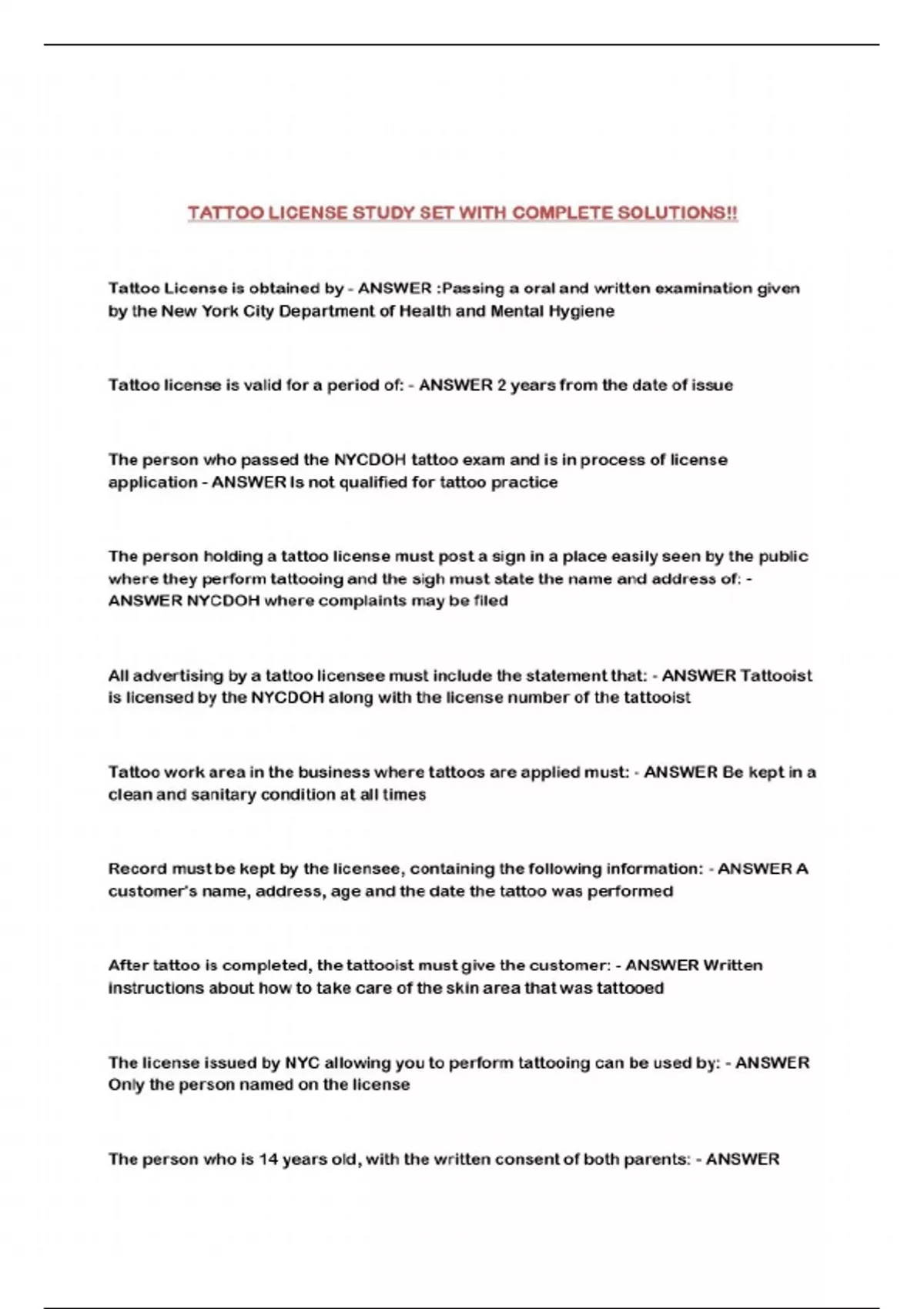 TATTOO LICENSE STUDY SET WITH COMPLETE SOLUTIONS!!...
