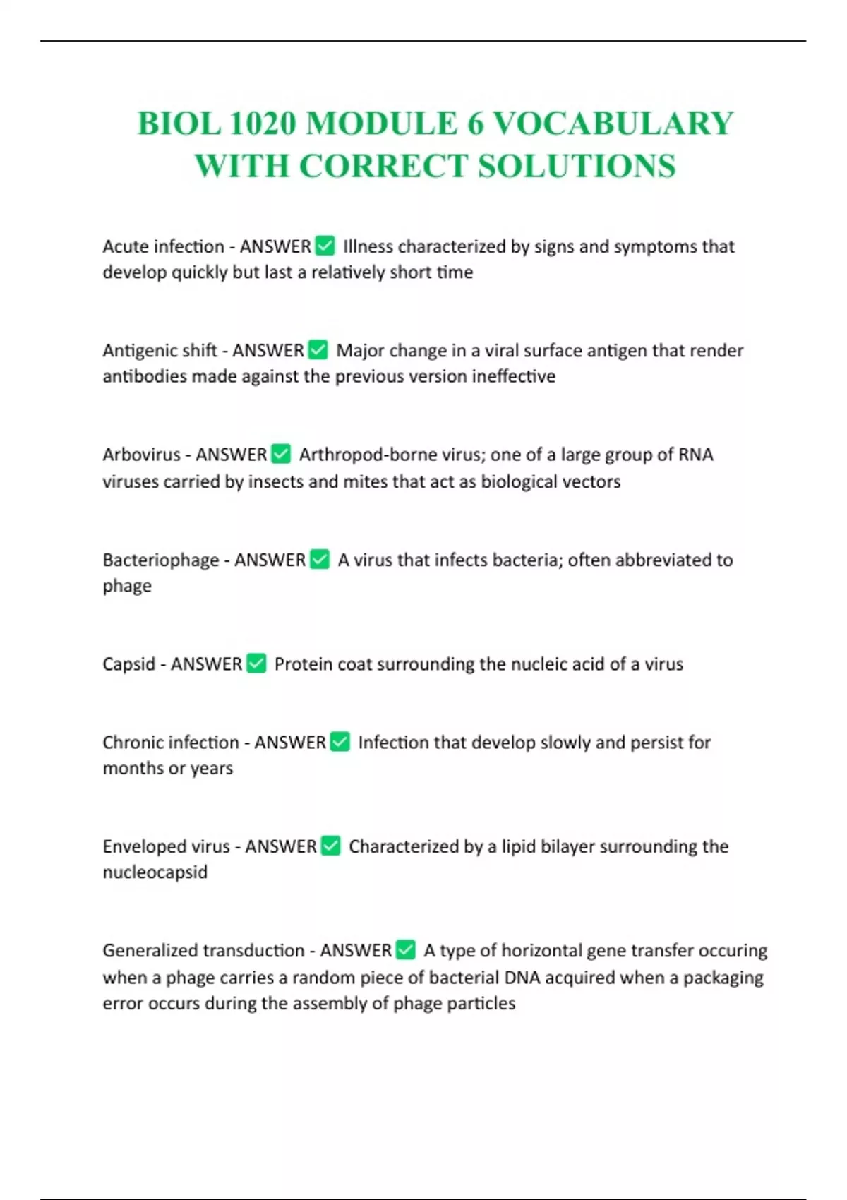 BIOL 1020 MODULE 6 VOCABULARY WITH CORRECT SOLUTIONS