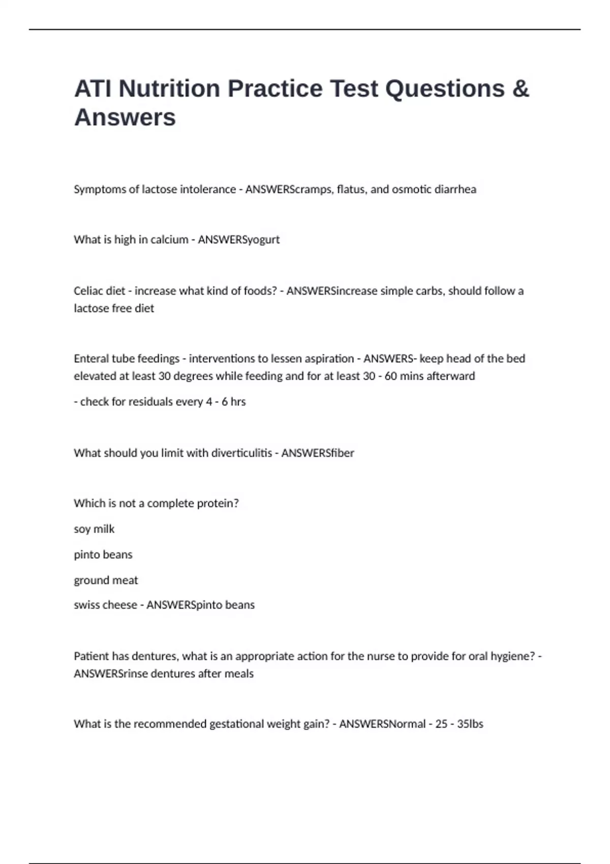 Enteral tube feedings - interventions to lessen aspiration - ANSWERS- keep head of the bed