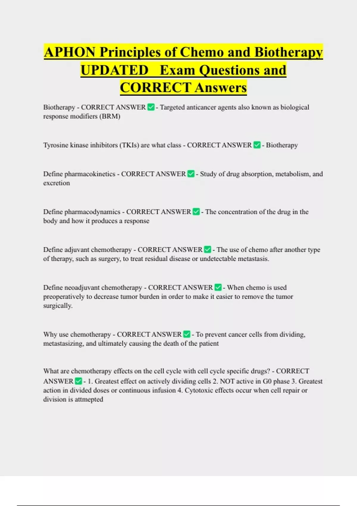 APHON Principles of Chemo and Biotherapy UPDATED Exam Questions and CORRECT Answers Biotherapy - CORRECT ANSWER - Targeted anticancer agents also known as biological response modifiers (BRM) Tyrosine kinase inhibitors (TKIs) are what class - CORRECT ANSWER - Biotherapy Define pharmacokinetics - CORRECT ANSWER - Study of drug absorption, metabolism, a