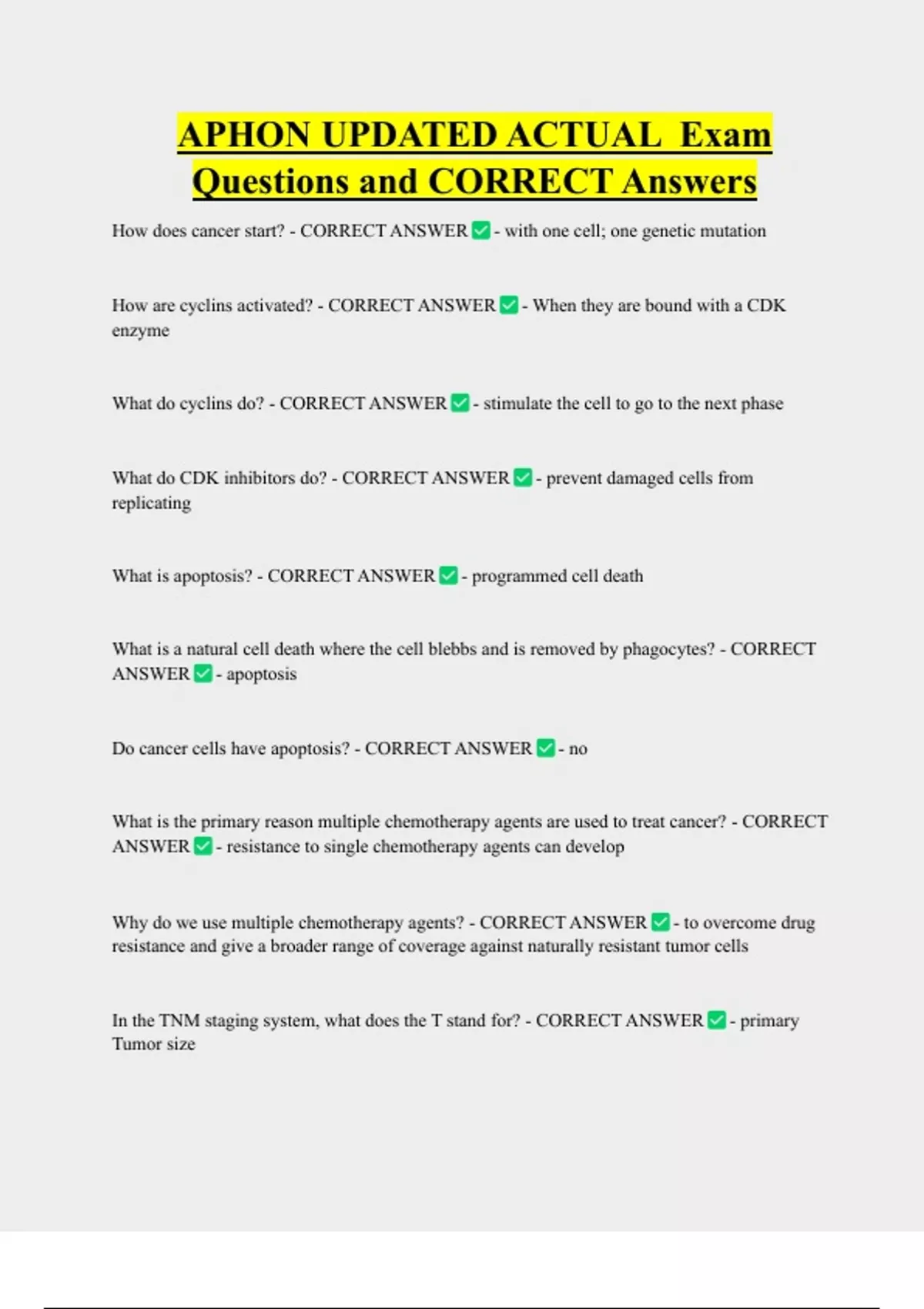 APHON UPDATED ACTUAL Exam Questions and CORRECT Answers How does cancer start? - CORRECT ANSWER - with one cell; one genetic mutation How are cyclins activated? - CORRECT ANSWER - When they are bound with a CDK enzyme What do cyclins do? - CORRECT ANSWER - stimulate the cell to go to the next phase What do CDK inhibitors do? - CORRECT ANSWER - prevent damaged cells from replicating What is apoptosis? - CORRECT ANSWER - programmed cell death
