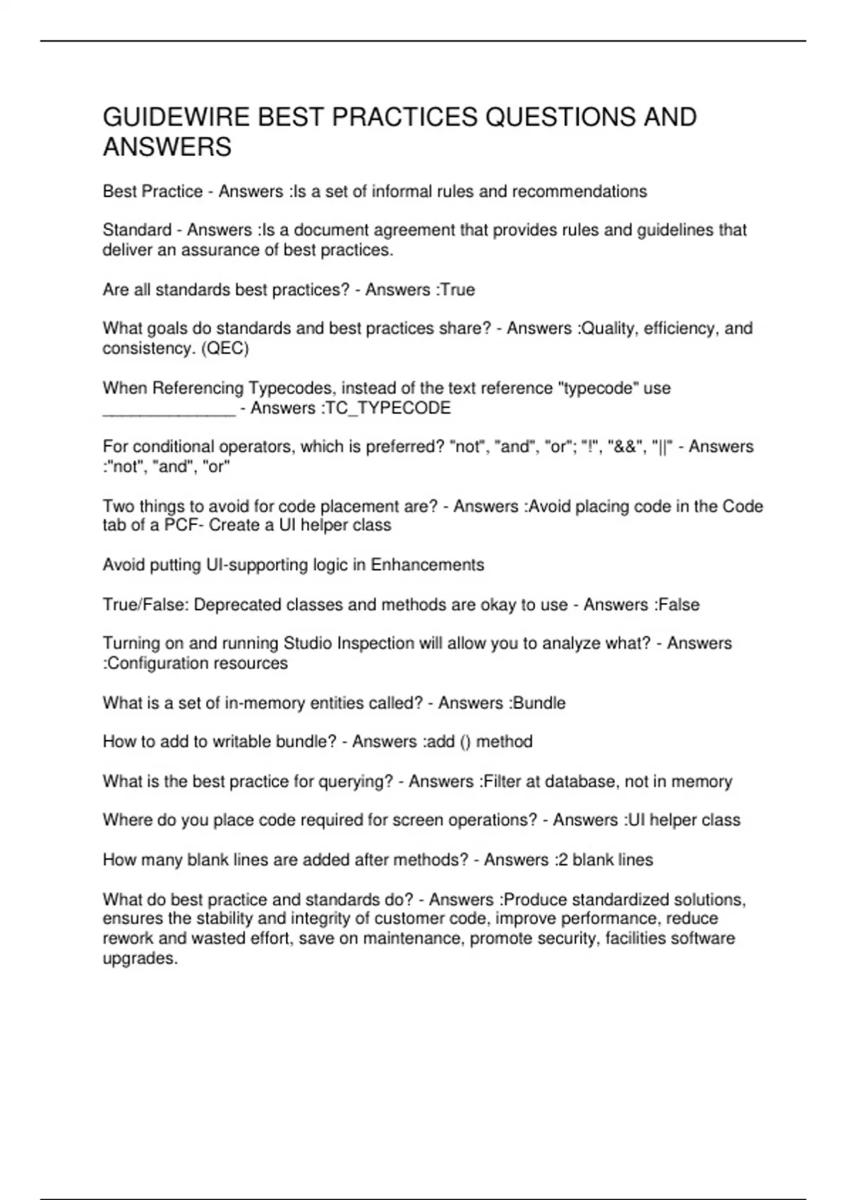 GUIDEWIRE BEST PRACTICES QUESTIONS AND ANSWERS