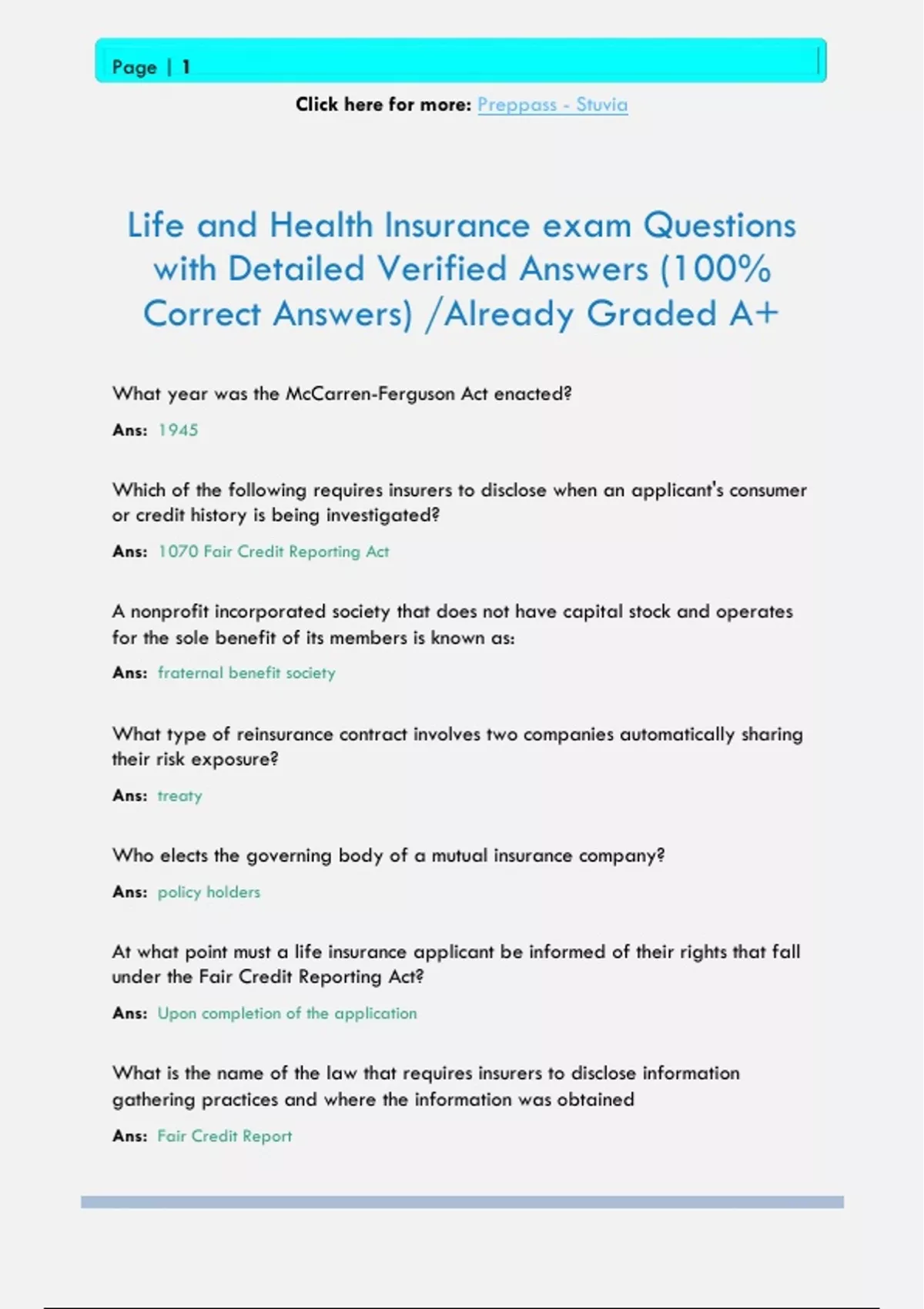 Life and Health Insurance exam Questions with Detailed Verified Answers (100% Correct Answers) /Already Graded A+ What year was the McCarren-Ferguson Act enacted? Ans: 1945
