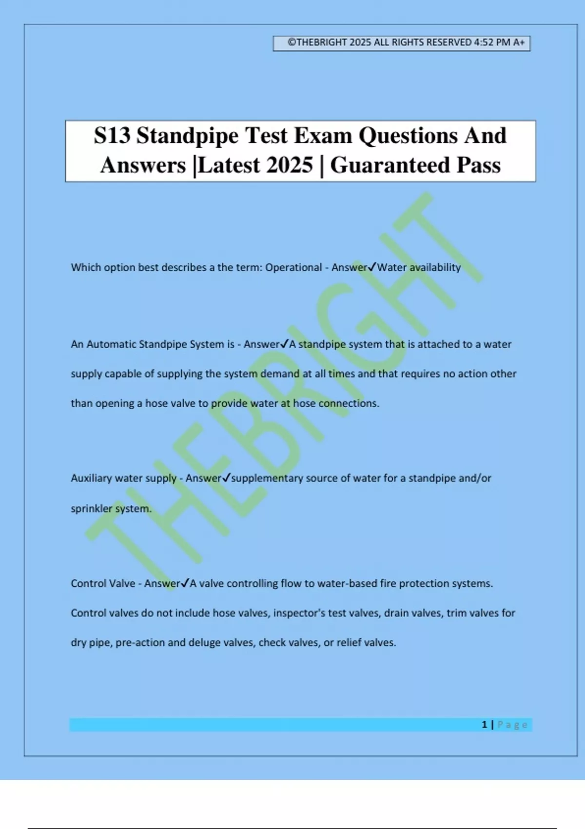 ©THEBRIGHT 2025 ALL RIGHTS RESERVED 4:52 PM A+ 1 | P a g e S13 Standpipe Test Exam Questions And Answers |Latest 2025 | Guaranteed Pass Which option best describes a the term: Operational - AnswerWater availability An Automatic Standpipe System is - AnswerA standpipe system that is attached to a water supply capable of supplying the system demand at all times and that requires no action other than opening a hose valve to provide water at hose connections. Auxiliary water supply - Answersupplementary source of water for a standpipe and/or sprinkler system. Control Valve - AnswerA valve controlling flow to water-based fire protection systems. Control valves do not include hose valves, inspector's test valves, drain valves, trim valves for dry pipe, pre-action and deluge valves, check valves, or relief valves. ©THEBRIGHT 2025 ALL RIGHTS RESERVED 4:52 PM A+ 2 | P a g e Branch line - AnswerA pipe system, generally in a horizontal plane, connecting not more than one hose connection with a standpipe. ___ is known as a Deficiency - AnswerA condition in which the application of the component is not within its designed limits or specifications. Discharge Device - AnswerA device designed to discharge water or foam-water solution in a predetermined, fixed, or adjustable pattern. What is a Dry Standpipe? - AnswerA standpipe system designed to have piping contain water only when the system is being utilized (No automatic water supply.) ____ is commonly refereed to as Dunnage - Answerdesigning a raised series of beams (usually steel) bearing on posts or bearing walls to support mechanical equipment (usually on a roof top). ©THEBRIGHT 2025 ALL RIGHTS RESERVED 4:52 PM A+ 3 | P a g e Fire Department Connection - AnswerA connection , normally on the exterior of the building, through which the fire department can pump supplemental water into the sprinkler system, standpipe, or other system furnishing water for fire extinguishment to supplement existing water supplies. (Formerly know as Siamese connection.) Fire Hose - AnswerA flexible conduit constructed with one or more reinforcements (Jackets), with or without a coating or covering but with an approved nonpermeable lining, or with an inner reinforcement between a protective cover and an approved nonpermeable lining. Fire Hydrant - AnswerA valve connection on a water supply system having one or more outlets and that is used to supply hose and fire department pumps with water. Fire Pump - AnswerA pump that is a provider of liquid flow and pressure dedicated to fire protection. A fire pump is a part of a fire standpipe system's water supply and can be powered by electric, diesel or steam. The pump intake is either connected to the public underground water supply piping or a static water source (e.g., tank, reservoir, lake). The pump provides water flow at higher pressure and volume to the standpipe system risers and hose standpipes.