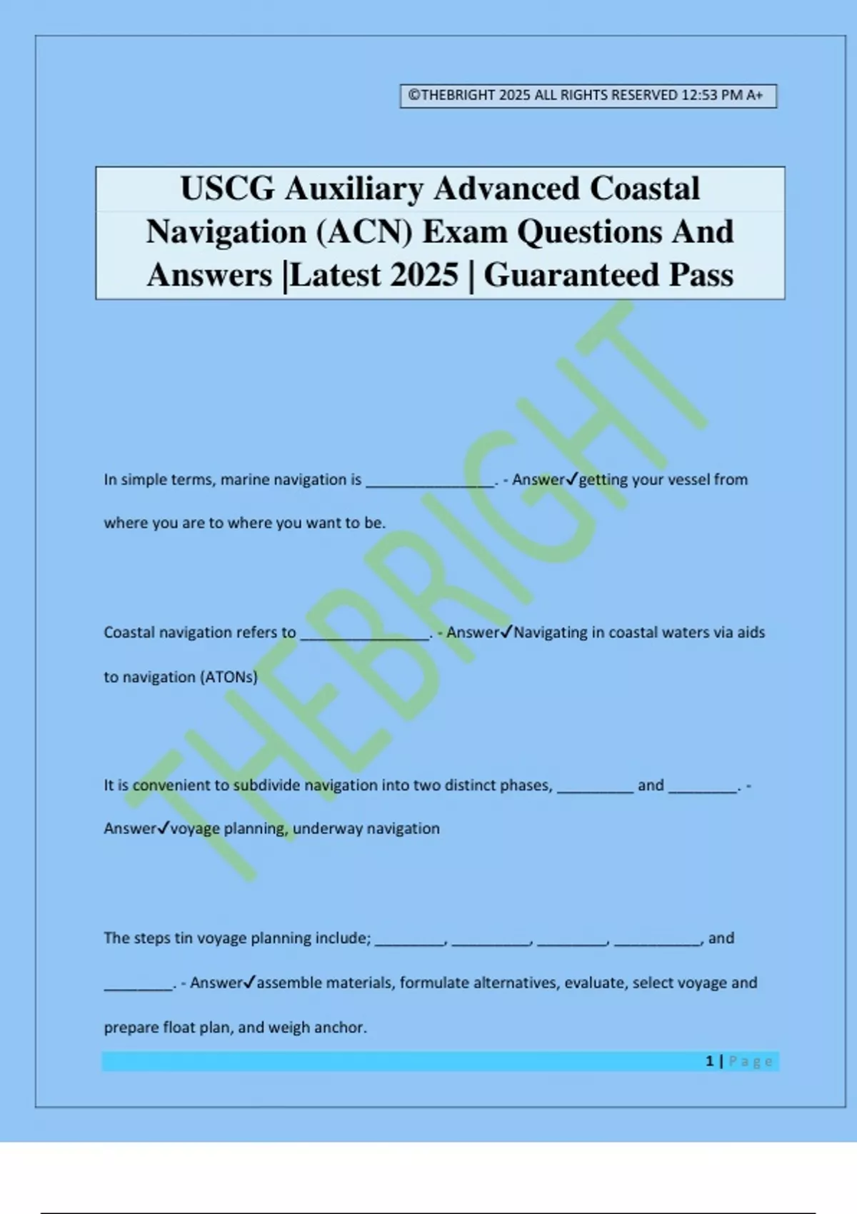 ©THEBRIGHT 2025 ALL RIGHTS RESERVED 12:53 PM A+ 1 | P a g e USCG Auxiliary Advanced Coastal Navigation (ACN) Exam Questions And Answers |Latest 2025 | Guaranteed Pass In simple terms, marine navigation is _______________. - Answergetting your vessel from where you are to where you want to be. Coastal navigation refers to _______________. - AnswerNavigating in coastal waters via aids to navigation (ATONs) It is convenient to subdivide navigation into two distinct phases, _________ and ________. - Answervoyage planning, underway navigation The steps tin voyage planning include; ________, _________, ________, __________, and ________. - Answerassemble materials, formulate alternatives, evaluate, select voyage and prepare float plan, and weigh anchor. ©THEBRIGHT 2025 ALL RIGHTS RESERVED 12:53 PM A+ 2 | P a g e For the purposes of this course, the earth is a ________ with a mean (average) diameter of _______ nautical miles, and a circumference of ______nautical miles. - AnswerSphere, 6,880, 21,614 The process of predicting the future position of a vessel from knowledge of its present (or starting) position, the course steered, and speed maintained is termed ______ ______. - Answerdead reckoning The earth revolves about an axis of rotation , which passes through the center of the earth and interesects the surface at two points, termed the _____ and ______ - Answernorth and south geographic poles A plane passed through the center of the earth intersects the surface of the earth to produce a geometric figure termed ______ _______. - Answergreat circle ON the surface of a sphere, the shortest distance between any two points lies on the _____ ______ connecting these tw