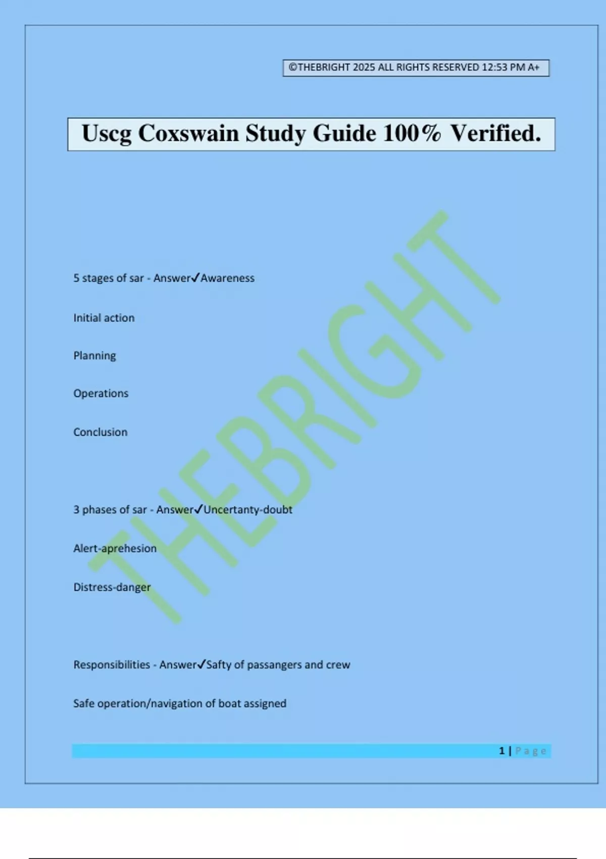 Uscg Coxswain Study Guide 100% Verified.