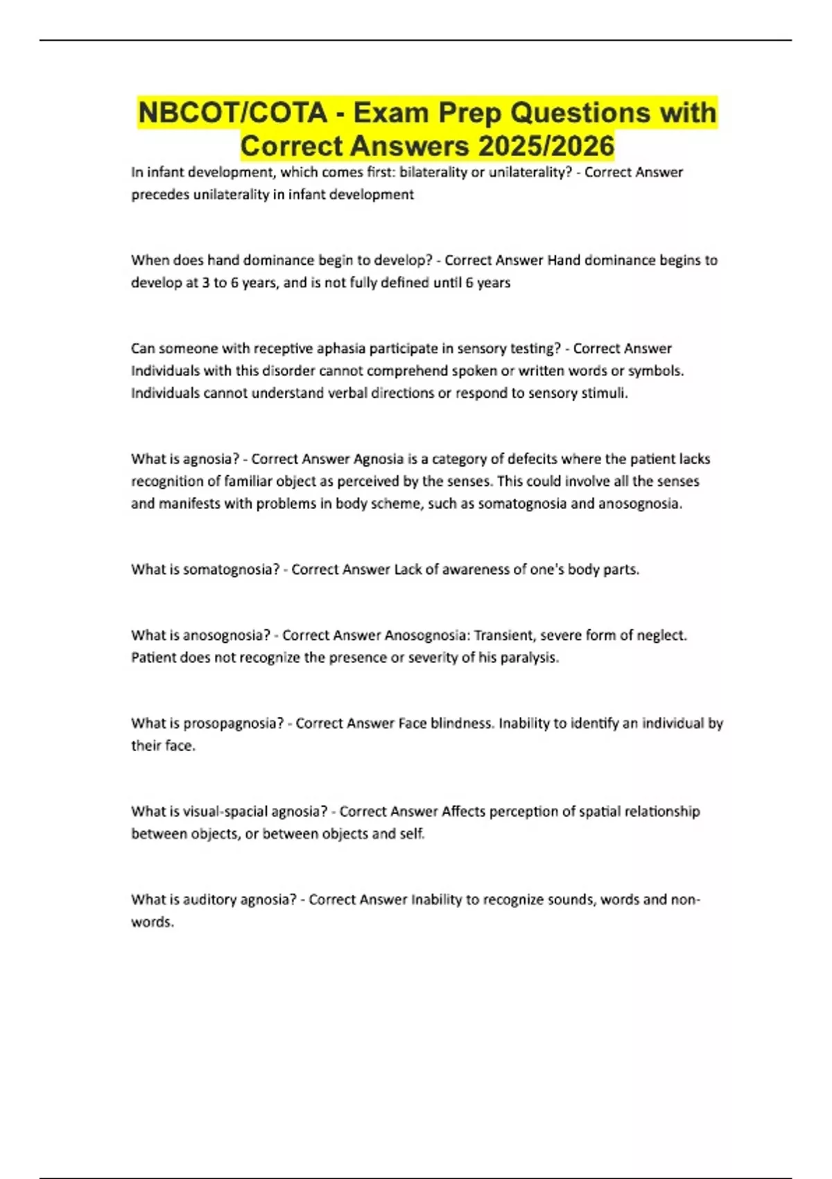 NBCOT/COTA - Exam Prep Questions with Correct Answers 2025/2026 In infant development, which comes first: bilaterality or unilaterality? - Correct Answer precedes unilaterality in infant development When does hand dominance begin to develop? - Correct Answer Hand dominance begins to develop at 3 to 6 years, and is not fully defined until 6 years Can someone with receptive aphasia participate in sensory testing? - Correct Answer Individuals with this disorder cannot comprehend spoken or written words or symbols. Individuals cannot understand verbal directions or respond to sensory stimuli. What is agnosia? - Correct Answer Agnosia is a category of defecits where the patient lacks recognition of familiar object as perceived by the senses. This could involve all the senses and manifests with problems in body scheme, such as somatognosia and anosognosia. What is somatognosia? - Correct Answer Lack of awareness of one's body parts. What is anosognosia? - Correct Answer Anosognosia: Transient, severe form of neglect. Patient does not recognize the presence or severity of his paralysis. What is prosopagnosia? - Correct Answer Face blindness. Inability to identify an individual by their face. What is visual-spacial agnosia? - Correct Answer Affects perception of spatial relationship between objects, or between objects and self. What is auditory agnosia? - Correct Answer Inability to recognize sounds, words and non-words.