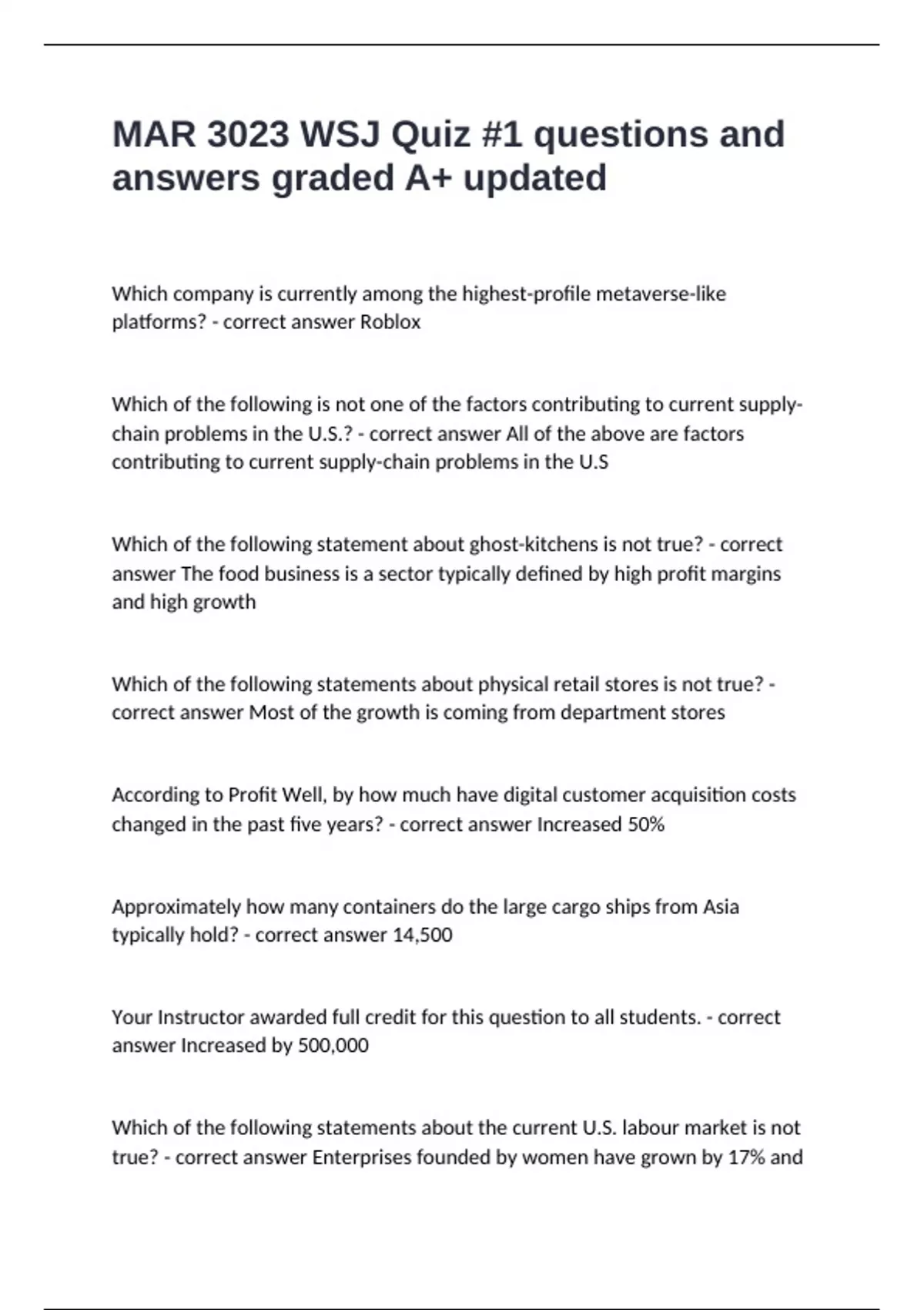 MAR 3023 WSJ Quiz #1 questions and answers graded A+ updated