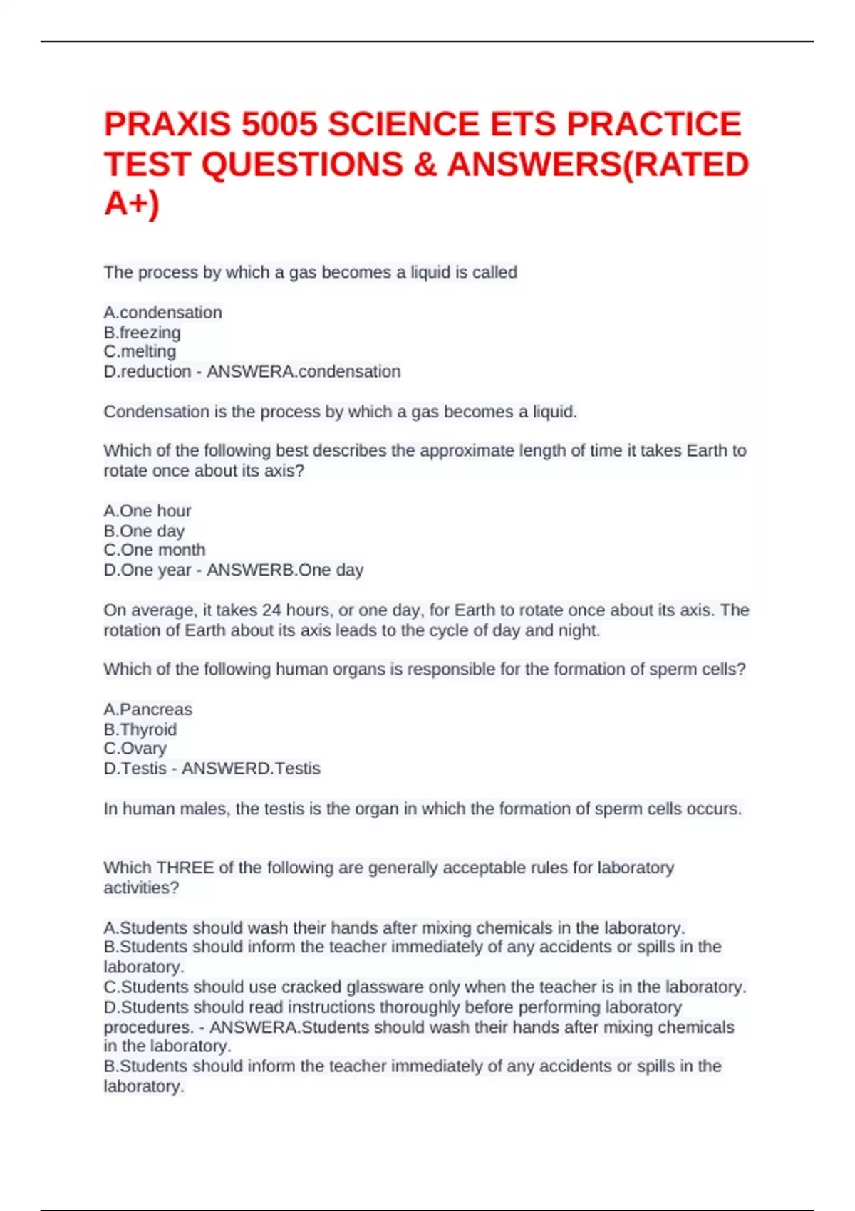 The process by which a gas becomes a liquid is called A.condensation B.freezing C.melting D.reduction - ANSWERA.condensation Condensation is the process by which a gas becomes a liquid. Which of the following best describes the approximate length of time it takes Earth to rotate once about its axis? A.One hour B.One day C.One month D.One year - ANSWERB.One day On average, it takes 24 hours, or one day, for Earth to rotate once about its axis. The rotation of Earth about its axis leads to the cycle of day and night. Which of the following human organs is responsible for the formation of sperm cells? A.Pancreas B.Thyroid C.Ovary D.Testis - ANSWERD.Testis In human males, the testis is the organ in which the formation of sperm cells occurs. Which THREE of the following are generally acceptable rules for laboratory activities? A.Students should wash their hands after mixing chemicals in the laboratory. B.Students should inform the teacher immediately of any accidents or spills in the laboratory. C.Students should use cracked glassware only when the teacher is in the laboratory. D.Students should read instructions thoroughly before performing laboratory procedures. - ANSWERA.Students should wash their hands after mixing chemicals in the laboratory. B.Students should inform the teacher immediately of any accidents or spills in the laboratory. D.Students should read instructions thoroughly before performing laboratory procedures To prevent accidental ingestion or absorption of potentially harmful substances, students should wash their hands after working with chemicals. To help maintain a safe environment, accidents and spills in the laboratory should be reported to the teacher immediately so that a correct response can be implemented. To safely and effectively complete laboratory procedures, students should read instructions thoroughly before starting the procedures. Cracked glassware is a safety hazard and should never be used. Which of the following processes most directly involves the movement of water from the atmosphere to Earth's surface? A.Infiltration B.Precipitation C.Transpiration