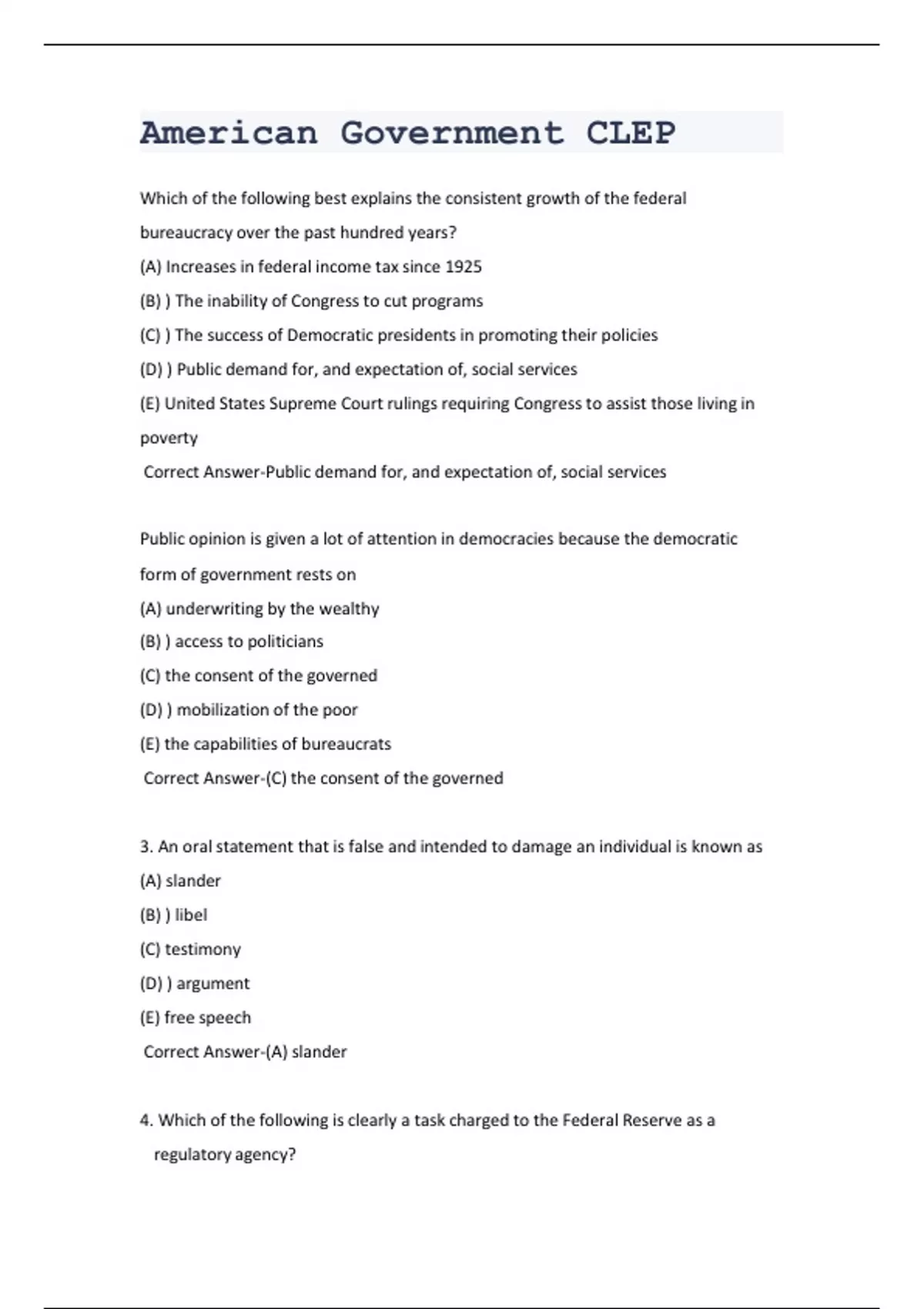 Correct Answer-(E) Providing financial services to depository institutions, the United