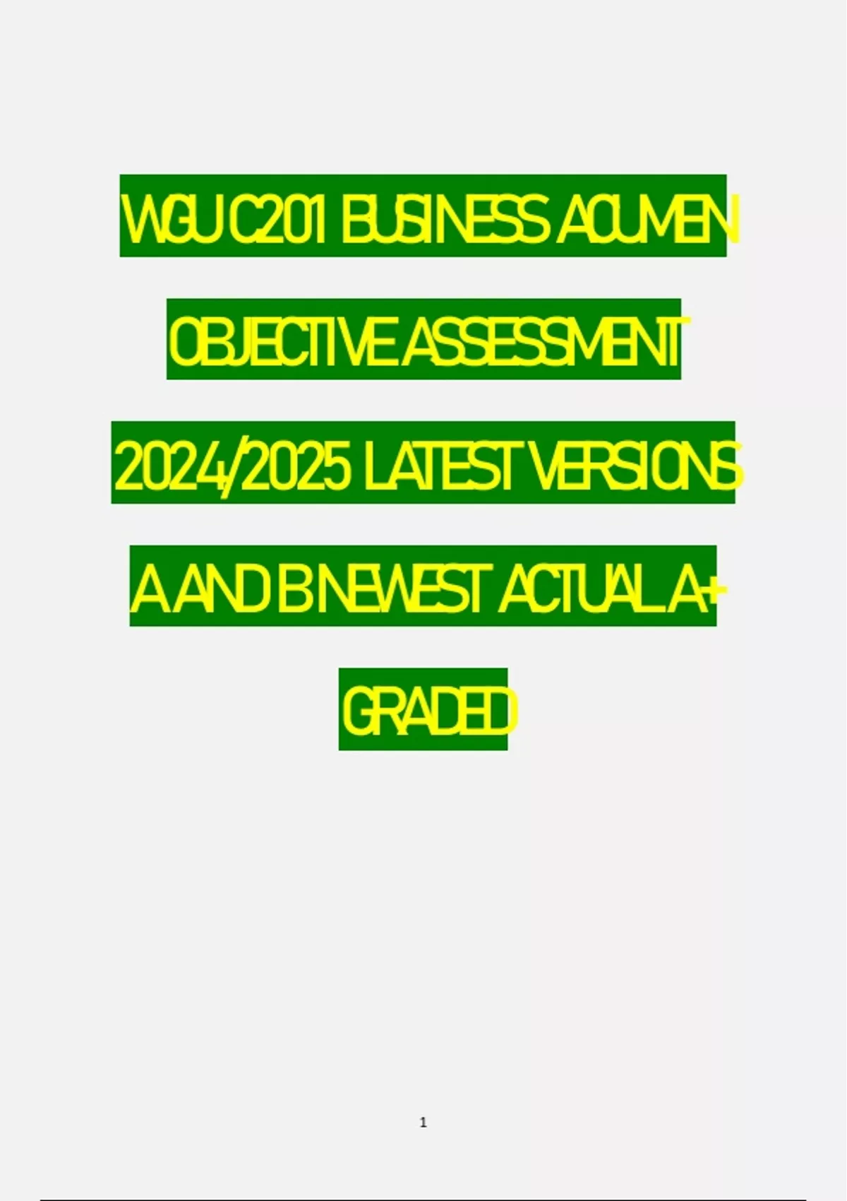 This updated WGU C201 Objective Assessment pack for 2024/2025 includes the latest Versions A and B, each fully graded with 100% correct answers. Designed to align perfectly with WGU’s Business Acumen curriculum, this bundle is ideal for students looking to master key business concepts like strategic thinking, operations, decision-making, and performance analysis. Trusted by WGU learners for accurate prep and reliable results — save time and walk into your test with total confidence.
