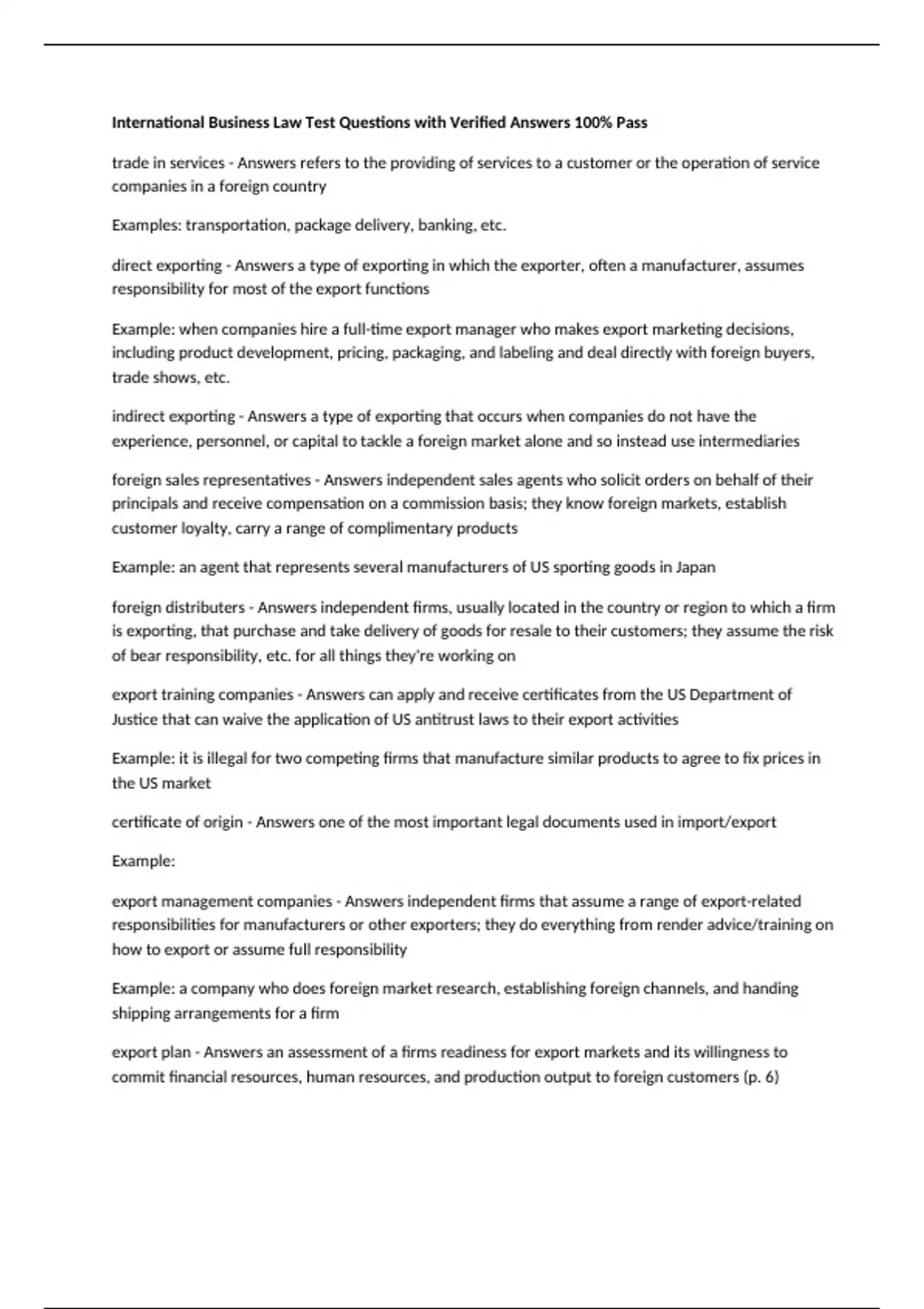 International Business Law Test Questions with Verified Answers 100% Pass trade in services - Answers refers to the providing of services to a customer or the operation of service companies in a foreign country Examples: transportation, package delivery, banking, etc. direct exporting - Answers a type of exporting in which the exporter, often a manufacturer, assumes responsibility for most of the export functions Example: when companies hire a full-time export manager who makes export marketing decisions, including product development, pricing, packaging, and labeling and deal directly with foreign buyers, trade shows, etc. indirect exporting - Answers a type of exporting that occurs when companies do not have the experience, personnel, or capital to tackle a foreign market alone and so instead use intermediaries foreign sales representatives - Answers independent sales agents who solicit orders on behalf of their principals and receive compensation on a commission basis; they know foreign markets, establish customer loyalty, carry a range of complimentary products Example: an agent that represents several manufacturers of US sporting goods in Japan foreign distributers - Answers independent firms, usually located in the country or region to which a firm is exporting, that purchase and take delivery of goods for resale to their customers; they assume the risk of bear responsibility, etc. for all things they're working on export training companies - Answers can apply and receive certificates from the US Department of Justice that can waive the application of US antitrust laws to their export activities Example: it is illegal for two competing firms that manufacture similar products to agree to fix prices in the US market certificate of origin - Answers one of the most important legal documents used in import/export Example: export management companies - Answers independent firms that assume a range of export-related responsibilities for manufacturers or other exporters; they do everything from render advice/training on how to export or assume full responsibility Example: a company who does foreign market research, establishing foreign channels, and handing shipping arrangements for a firm export plan - Answers an assessment of a firms readiness for export markets and its willingness to commit financial resources, human resources, and production output to foreign customers (p. 6) intellectual property (IP) - Answers the legal rights which result form intellectual activity in the industrial, scientific, literary, and artistic fields Examples: patents, trademarks, copyrights, etc. licensing agreements - Answers contracts which the holder of intellectual property will grant certain rights in that property to another party under certain conditions and for a certain time; can either be exclusive or non exclusive, and frequently limit distribution to a certain geographical area or a certain period of time Example: Russian Entertainment Wholesale, Inc. v. Close-Up International, Inc. infringement - Answers refers to the violation of the IP rights of another, and often occurs in the unauthorized use, distribution, or appropriation of those rights Example: piracy or counterfeiting World Intellectual Property Organization (WIPO) - Answers a specialized agency in the UN that fosters government cooperation in developing IP policies and coordinates registrations in some IP areas; arbitrates to resolve IP disputes between parties Example: solves a dispute over patent, trademarks, etc. between corporations franchising - Answers a business arrangement that uses an agreement to license, control, and protect the use of the franchisors patents, trademarks, etc. Example: the most common form of franchising is known as business operations franchise and is usually used in retailing World Trade Organization (WTO) - Answers helps member countries assure a more uniform