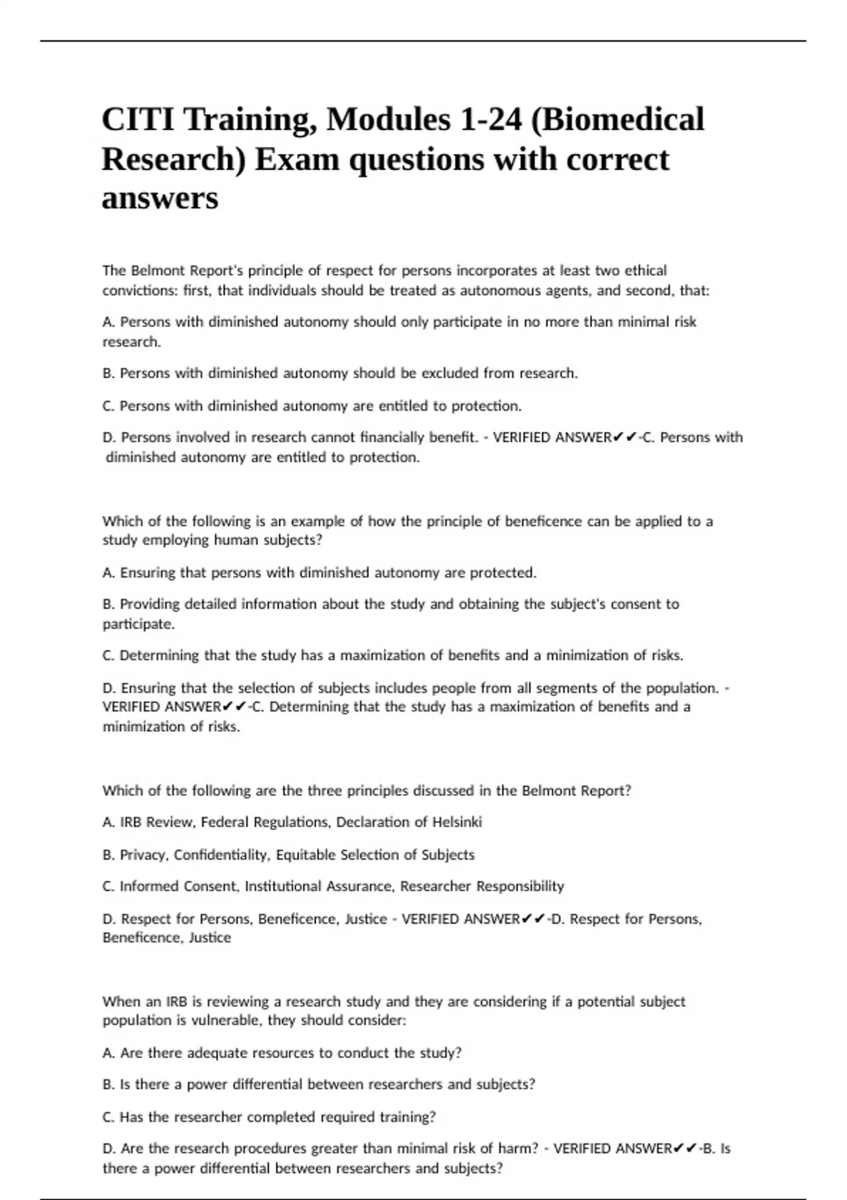 D. |Identified |the |basic |ethical |principles |of |human |subjects |research. |- |VERIFIED |ANSWER✔✔-C. |