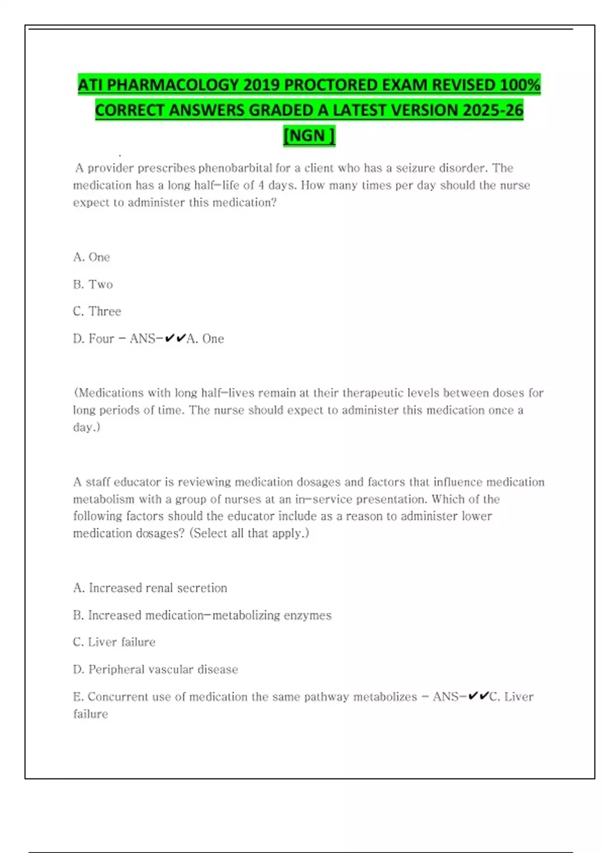ATI PHARMACOLOGY 2019 PROCTORED EXAM REVISED 100% CORRECT ANSWERS GRADED A LATEST VERSION 2025-26 [NGN ] A provider prescribes phenobarbital for a client who has a seizure disorder. The medication has a long half-life of 4 days. How many times per day should the nurse expect to administer this medication? A. One B. Two C. Three D. Four - ANS-A. One (Medications with long half-lives remain at their therapeutic levels between doses for long periods of time. The nurse should expect to administer this medication once a day.) A staff educator is reviewing medication dosages and factors that influence medication metabolism with a group of nurses at an in-service presentation. Which of the following factors should the educator include as a reason to administer lower medication dosages? (Select all that apply.) A. Increased renal secretion B. Increased medication-metabolizing enzymes C. Liver failure D. Peripheral vascular disease E. Concurrent use of medication the same pathway metabolizes - ANS-...
