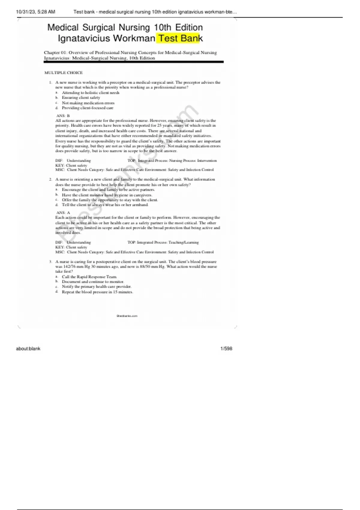 , 10/31/23, 5:28 AM Test bank - medical surgical nursing 10th edition ignatavicius workman-bte…