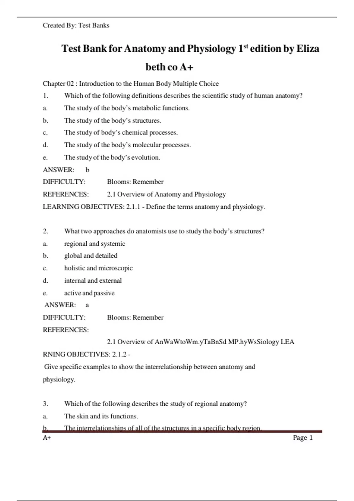 Test Bank - Anatomy and Physiology, 1st Edition ,Elizabeth Co