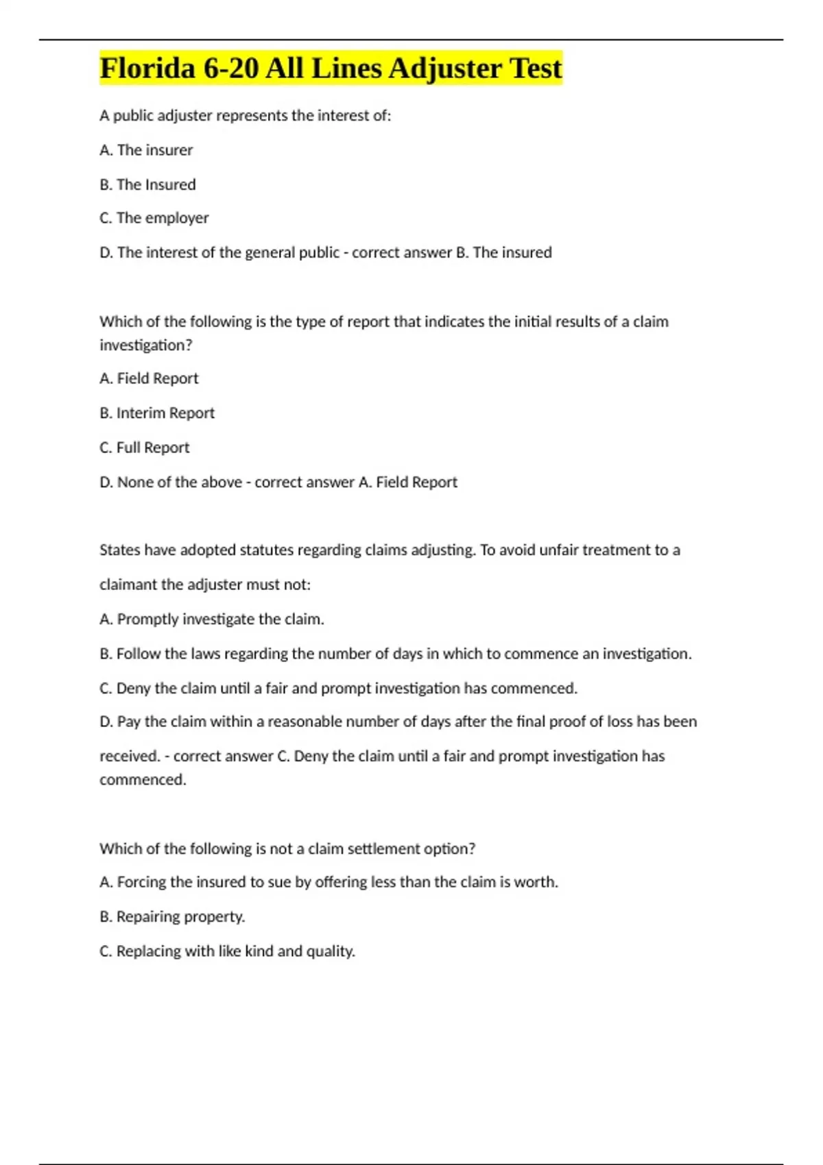 A public adjuster represents the interest of: A. The insurer B. The Insured C. The employer D. The interest of the general public - correct answer B. The insured Which of the following is the type of report that indicates the initial results of a claim investigation? A. Field Report B. Interim Report C. Full Report D. None of the above - correct answer A. Field Report States have adopted statutes regarding claims adjusting. To avoid unfair treatment to a claimant the adjuster must not: A. Promptly investigate the claim. B. Follow the laws regarding the number of days in which to commence an investigation. C. Deny the claim until a fair and prompt investigation has commenced. D. Pay the claim within a reasonable number of days after the final proof of loss has been received. - correct answer C. Deny the claim until a fair and prompt investigation has commenced. Which of the following is not a claim settlement option? A. Forcing the insured to sue by offering less than the claim is worth. B. Repairing property. C. Replacing with like kind and quality.