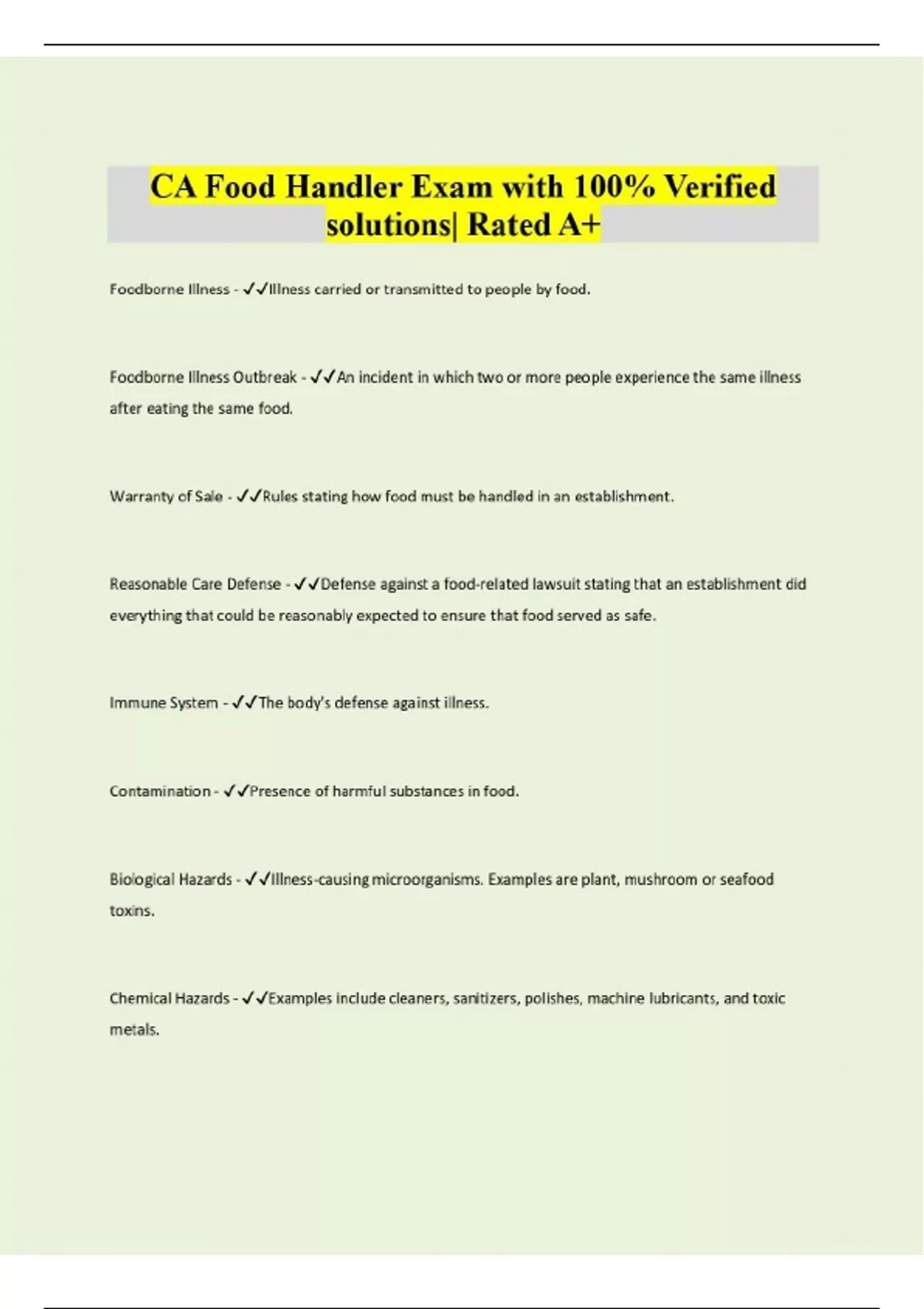 CA Food Handler Exam with 100% Verified solutions| Rated A+