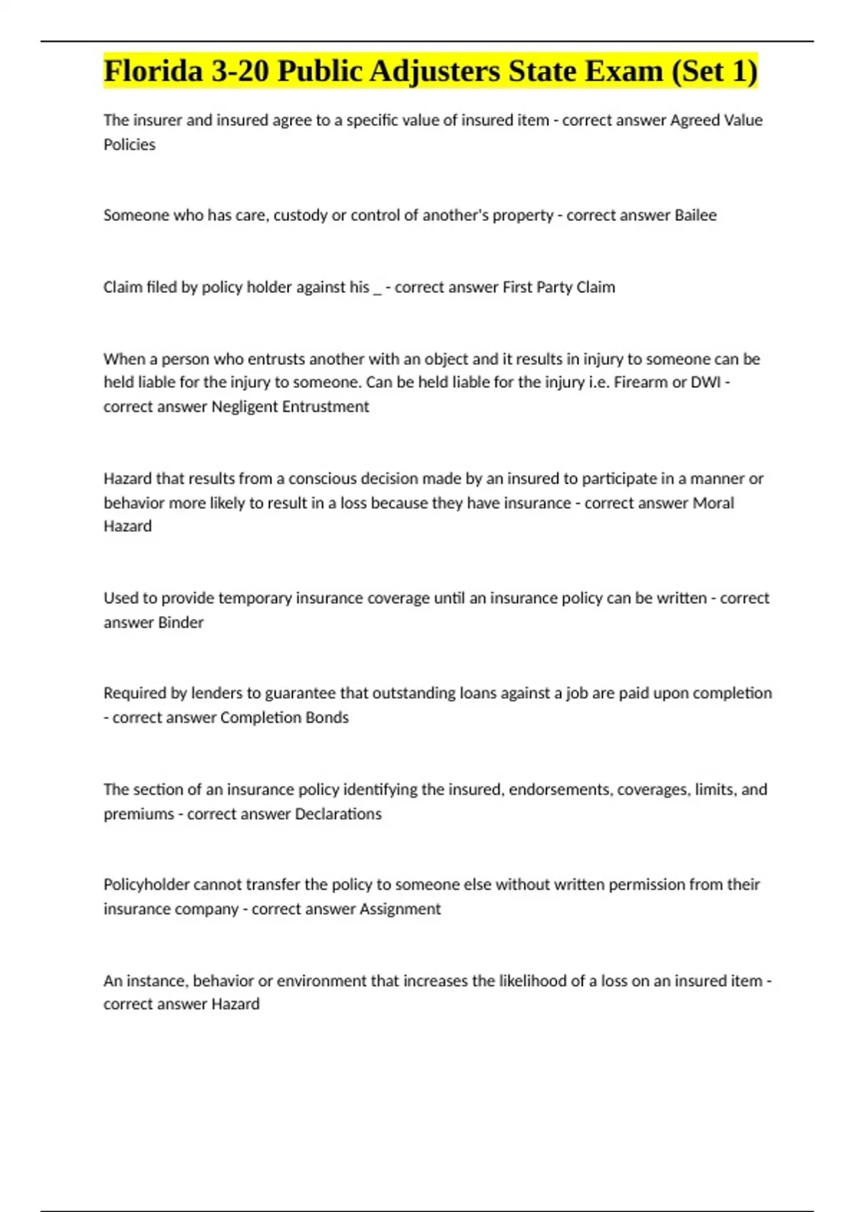 Florida 3-20 Public Adjusters State Exam (Set 1) questions and revised correct solutions
