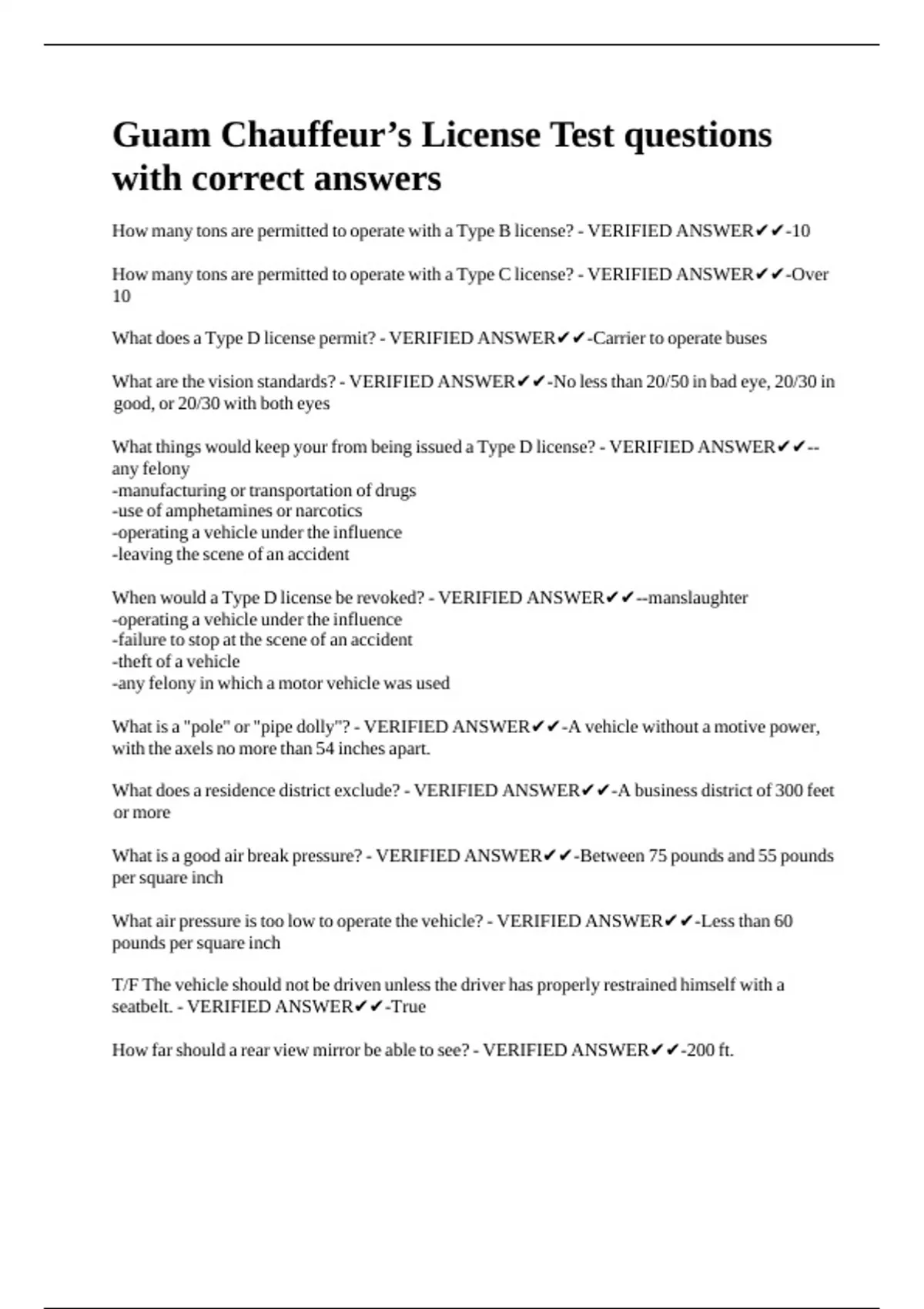 Guam Chauffeur’s License Test questions