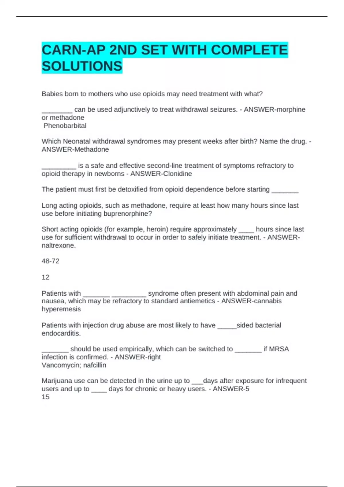 CARN-AP 2ND SET WITH COMPLETE SOLUTIONSCARN-AP 2ND SET WITH COMPLETE SOLUTIONSCARN-AP 2ND SET WITH COMPLETE SOLUTIONS Babies born to mothers who use opioids may need treatment with what? ________ can be used adjunctively to treat withdrawal seizures. - ANSWER-morphine or methadone Phenobarbital Which Neonatal withdrawal syndromes may present weeks after birth? Name the drug. - ANSWER-Methadone _________ is a safe and effective second-line treatment of symptoms refractory to opioid therapy in newborns - ANSWER-Clonidine The patient must first be detoxified from opioid dependence before starting _______
