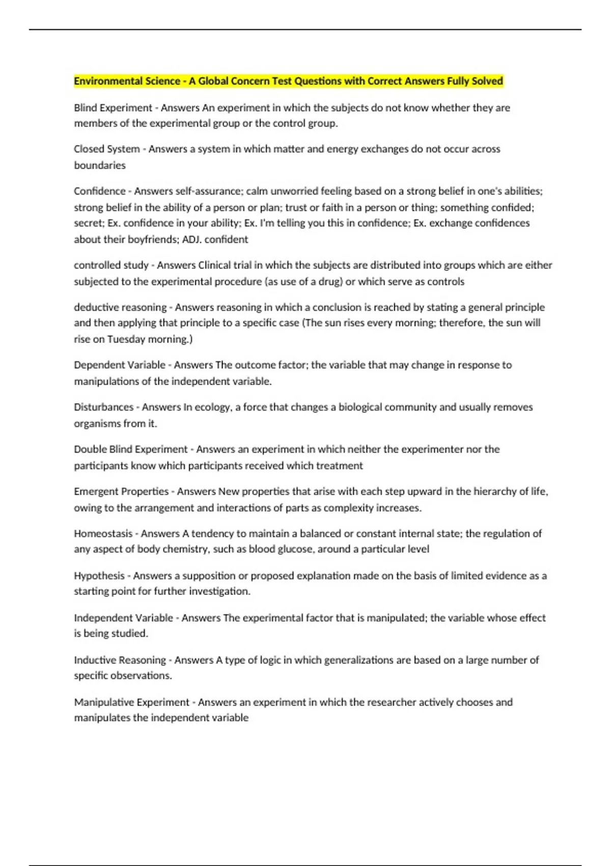 Environmental Science - A Global Concern Test Questions with Correct Answers Fully Solved Blind Experiment - Answers An experiment in which the subjects do not know whether they are members of the experimental group or the control group. Closed System - Answers a system in which matter and energy exchanges do not occur across boundaries Confidence - Answers self-assurance; calm unworried feeling based on a strong belief in one's abilities; strong belief in the ability of a person or plan; trust or faith in a person or thing; something confided; secret; Ex. confidence in your ability; Ex. I'm telling you this in confidence; Ex. exchange confidences about their boyfriends; ADJ. confident controlled study - Answers Clinical trial in which the subjects are distributed into groups which are either subjected to the experimental procedure (as use of a drug) or which serve as controls deductive reasoning - Answers reasoning in which a conclusion is reached by stating a general principle and then applying that principle to a specific case (The sun rises every morning; therefore, the sun will rise on Tuesday morning.) Dependent Variable - Answers The outcome factor; the variable that may change in response to manipulations of the independent variable. Disturbances - Answers In ecology, a force that changes a biological community and usually removes organisms from it. Double Blind Experiment - Answers an experiment in which neither the experimenter nor the participants know which participants received which treatment Emergent Properties - Answers New properties that arise with each step upward in the hierarchy of life, owing to the arrangement and interactions of parts as complexity increases. Homeostasis - Answers A tendency to maintain a balanced or constant internal state; the regulation of any aspect of body chemistry, such as blood glucose, around a particular level Hypothesis - Answers a supposition or proposed explanation made on the basis of limited evidence as a starting point for further investigation. Independent Variable - Answers The experimental factor that is manipulated; the variable whose effect is being studied. Inductive Reasoning - Answers A type of logic in which generalizations are based on a large number of specific observations. Manipulative Experiment - Answers an experiment in which the researcher actively chooses and manipulates the independent variable Mean - Answers the arithmetic average of a distribution, obtained by adding the scores and then dividing by the number of scores models - Answers Provide an approximation (physical/conceptual representation) of a scientific phenomenon that cannot be observed directly Natural Experiment - Answers An experiment in which nature, rather than an experimenter, manipulates an independent variable. Negative Feedback - Answers A primary mechanism of homeostasis, whereby a change in a physiological variable that is being monitored triggers a response that counteracts the initial fluctuation. Paradigm Shift - Answers a fundamental change in approach or underlying assumptions. Positive Feedback - Answers A type of regulation that responds to a change in conditions by initiating responses that will amplify the change. Takes organism away from a steady state. Reproducibility - Answers making an observation or obtaining a particular result more than once Resilience - Answers the rate at which an ecosystem returns to its original state after a disturbance Scientific Consensus - Answers (general agreement among informed scholars) stems from a community of scientists who collaborate in a cumulative, self-correcting process. Science Literacy - Answers the knowledge and understanding of scientific concepts and processes required for personal decision making, participation in civic and cultural affairs, and economic productivity Scientific Theory - Answers A well-tested explanation for a wide range of observations or experimental results. State Shift - Answers a severe disturbance in which the system does not return to normal but instead results in significant changes in some of its state variables Acids - Answers substances that release hydrogen ions when dissolved in water Atomic Number - Answers the number of protons in the nucleus of an a
