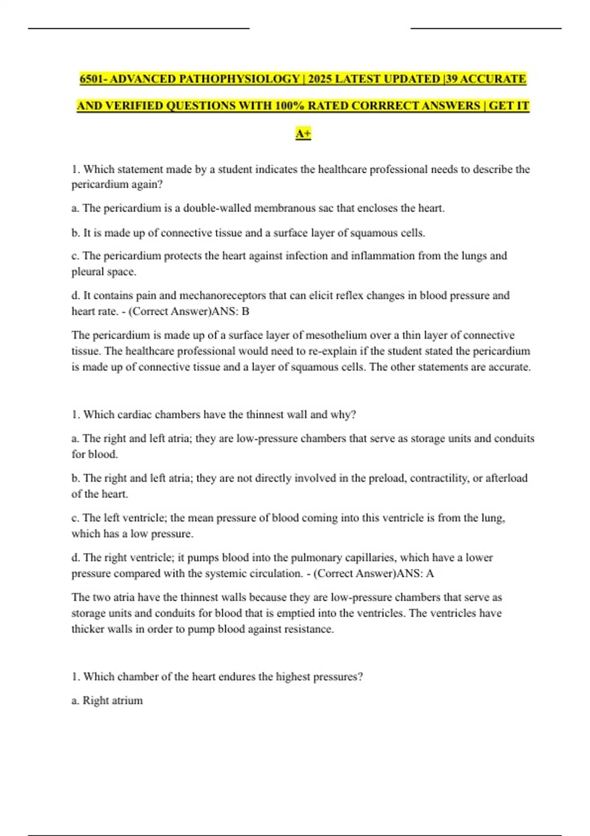 1. Which chamber of the heart endures the highest pressures?