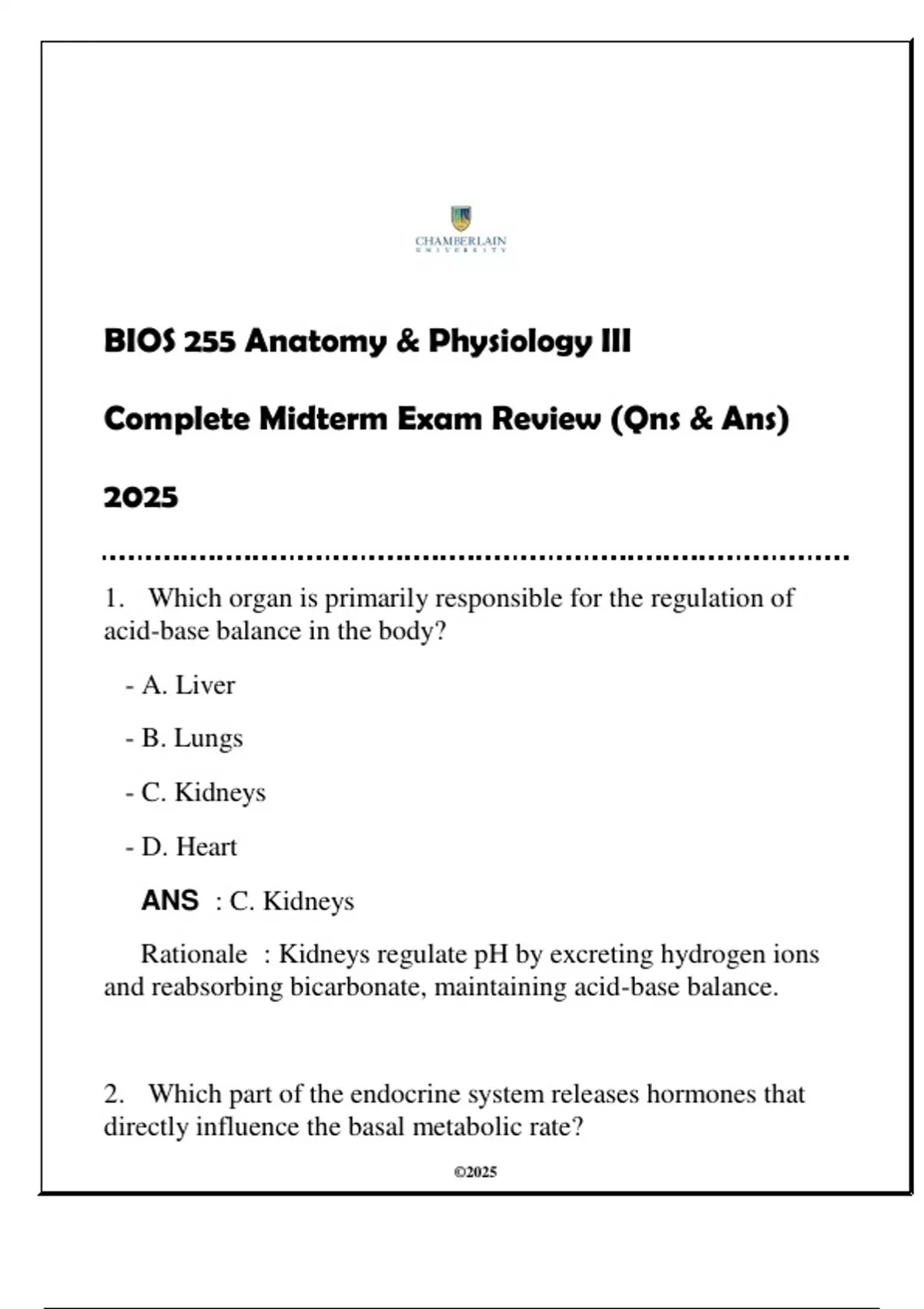 BIOS 255 (A&P III) Complete Midterm Exam Review (Qns & Ans) 2025