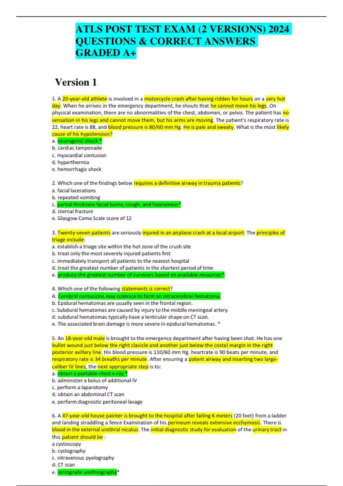 ATLS POST TEST EXAM (2 VERSIONS) 2024