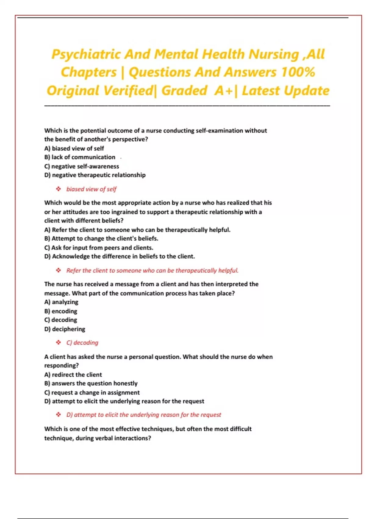 Psychiatric And Mental Health Nursing ,All Chapters | Questions And Answers 100% Original Verified| Graded A+| Latest Update
