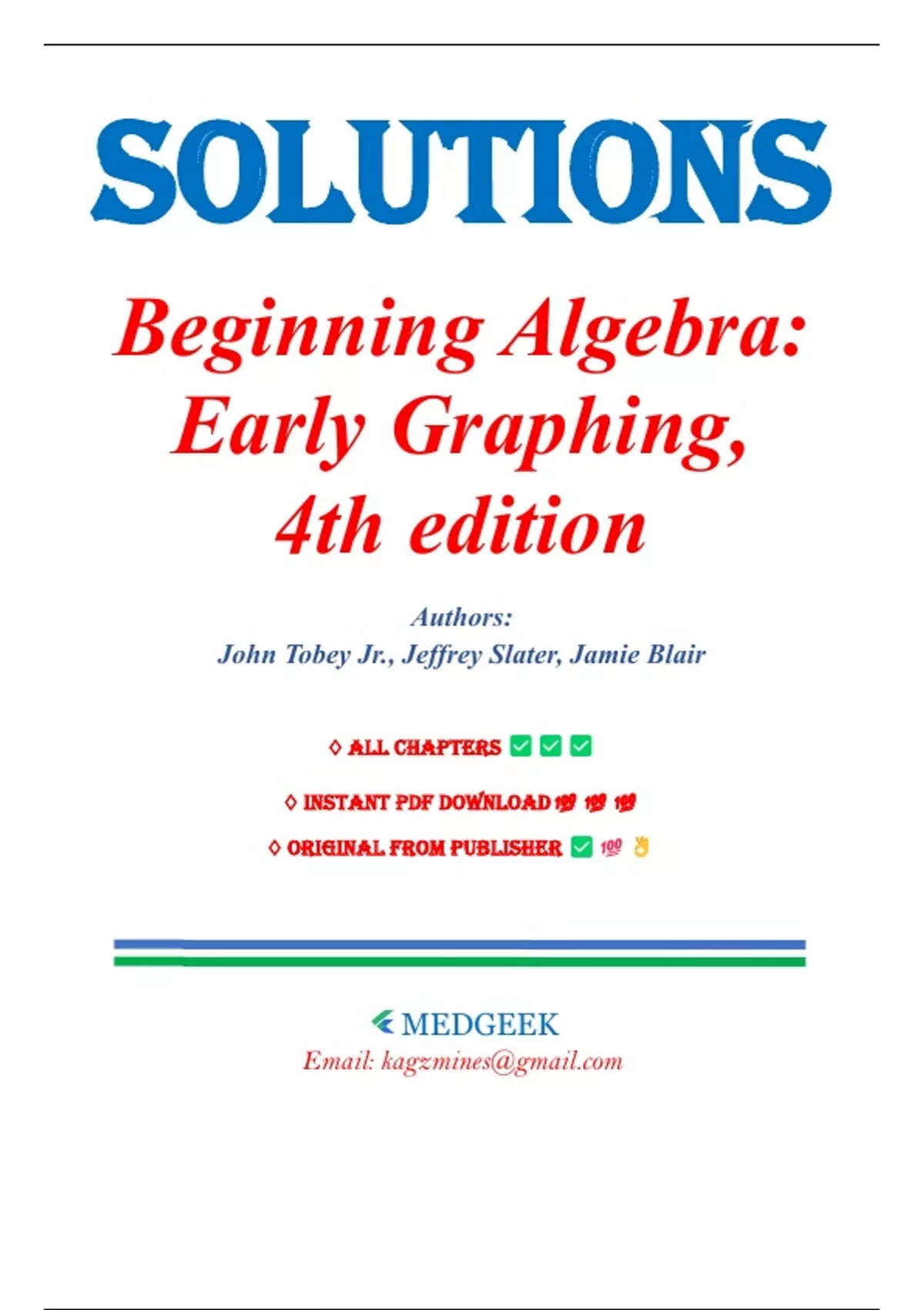 Solutions for Beginning Algebra: Early Graphing 4th Edition by John Tobey, All Chapters 1-9