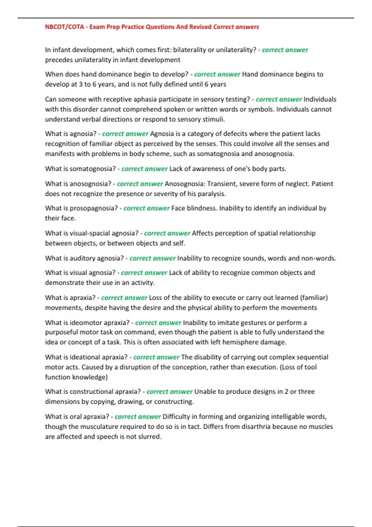 , NBCOT/COTA - Exam Prep Practice Questions And Revised Correct answers